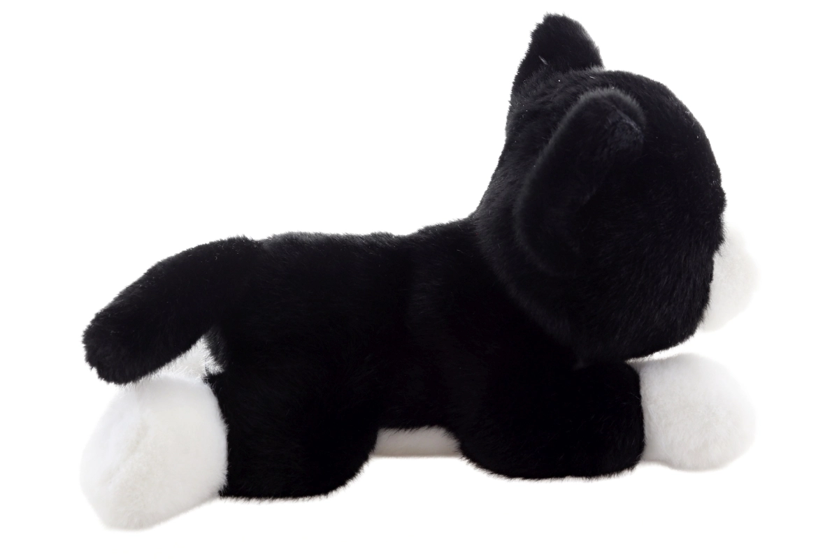 Kontrastno crno‑bijelo krzno, ružičasta njuškica i izvezeni detalji stvaraju izgled pravog mačića.