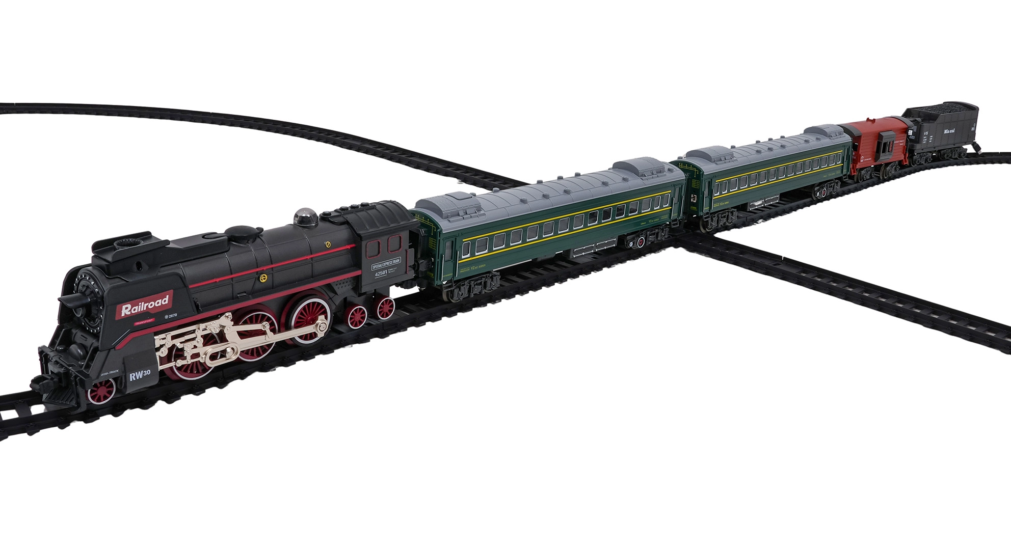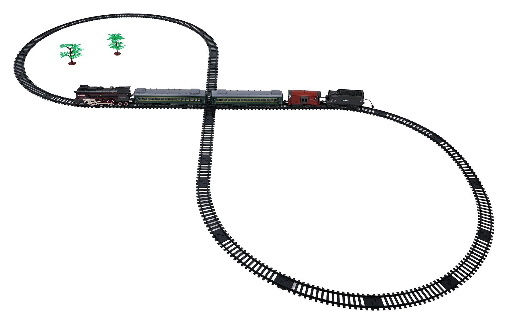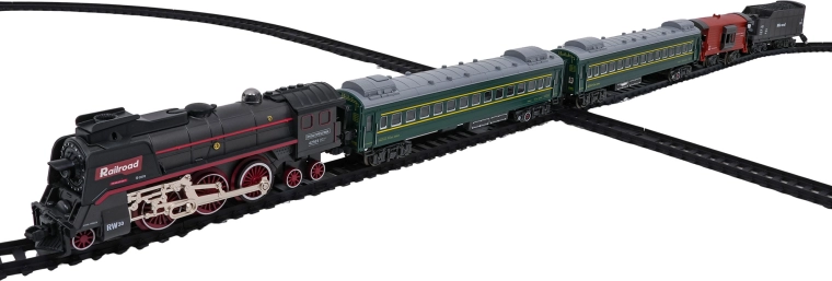 Set uključuje lokomotivu, 2 putnička vagona, vagon s ugljenom i teretni/životinjski vagon, koji zajedno čine impresivnu kompoziciju. Izdržljive plastične tračnice brzo se sastavljaju u veliki krug dimenzija približno 216 × 92,5 cm. Za mirniju igru moguće je isključiti zvukove lokomotive.