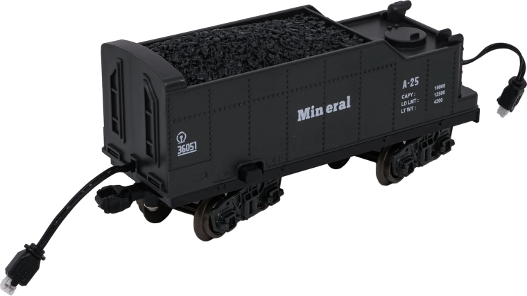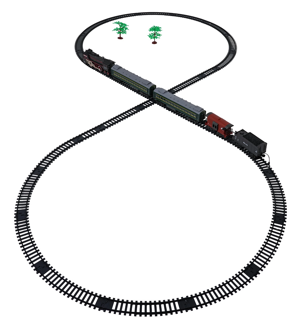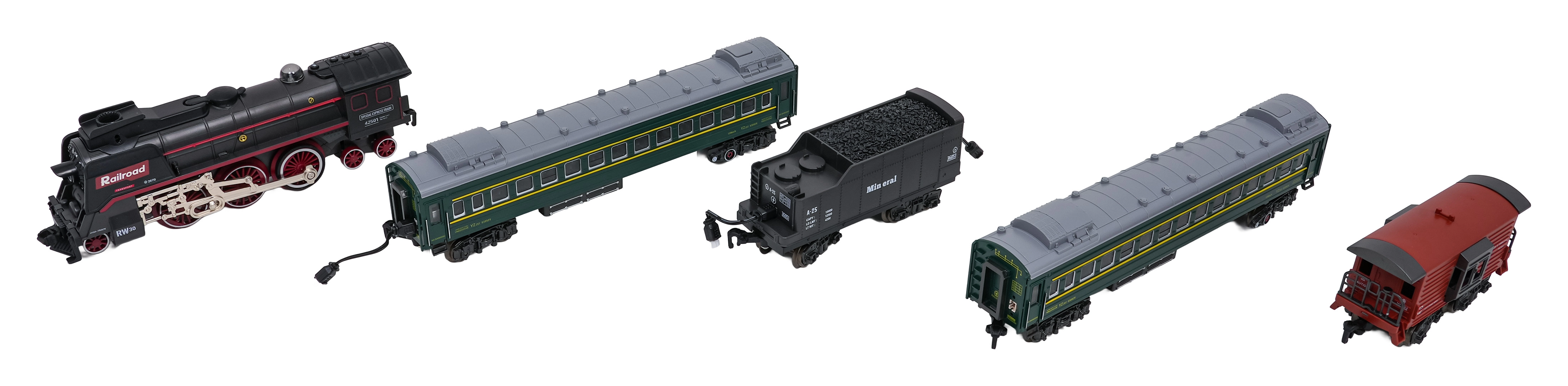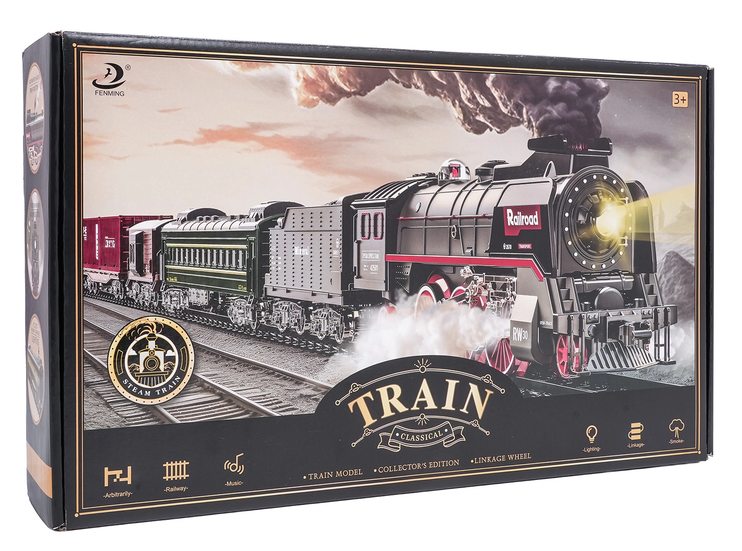 Set uključuje lokomotivu, 2 putnička vagona, vagon s ugljenom i teretni/životinjski vagon, koji zajedno čine impresivnu kompoziciju. Izdržljive plastične tračnice brzo se sastavljaju u veliki krug dimenzija približno 216 × 92,5 cm. Za mirniju igru moguće je isključiti zvukove lokomotive.