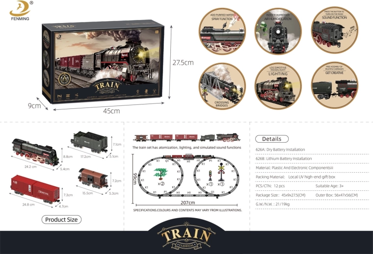 Krenite na nostalgičnu vožnju s retro vlakićem koji donosi doživljaj kao na pravoj željeznici. Lokomotiva tijekom vožnje ispušta dim iz dimnjaka i bočnih otvora (dovoljno je dodati vodu priloženom pipetom), prednji reflektor svijetli, a čuju se autentični zvukovi. Tračnice su čvrste, sigurne i vrlo jednostavne za spajanje.