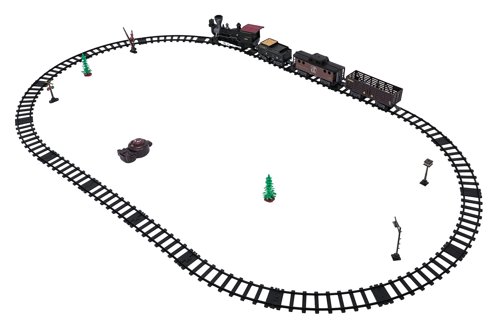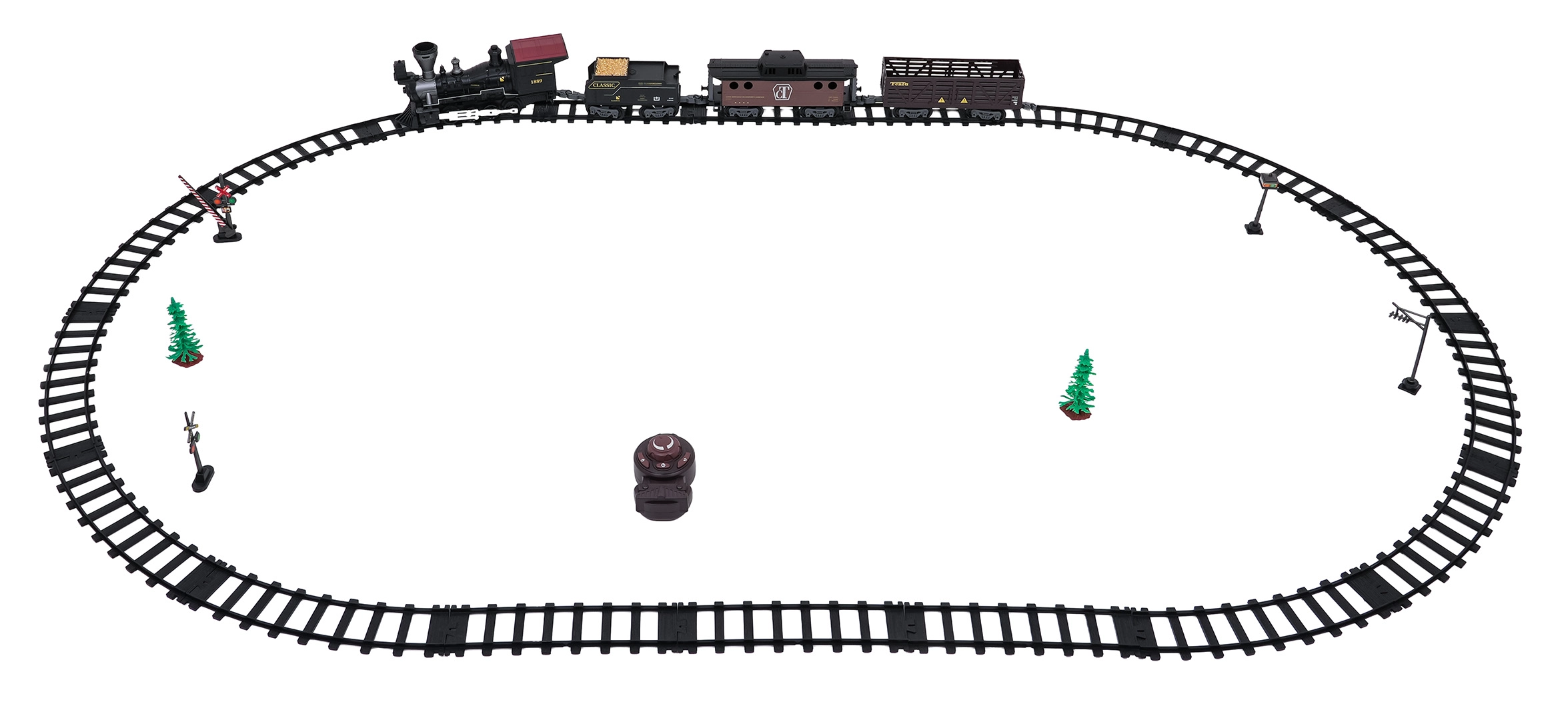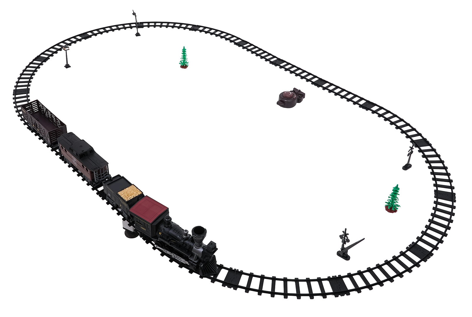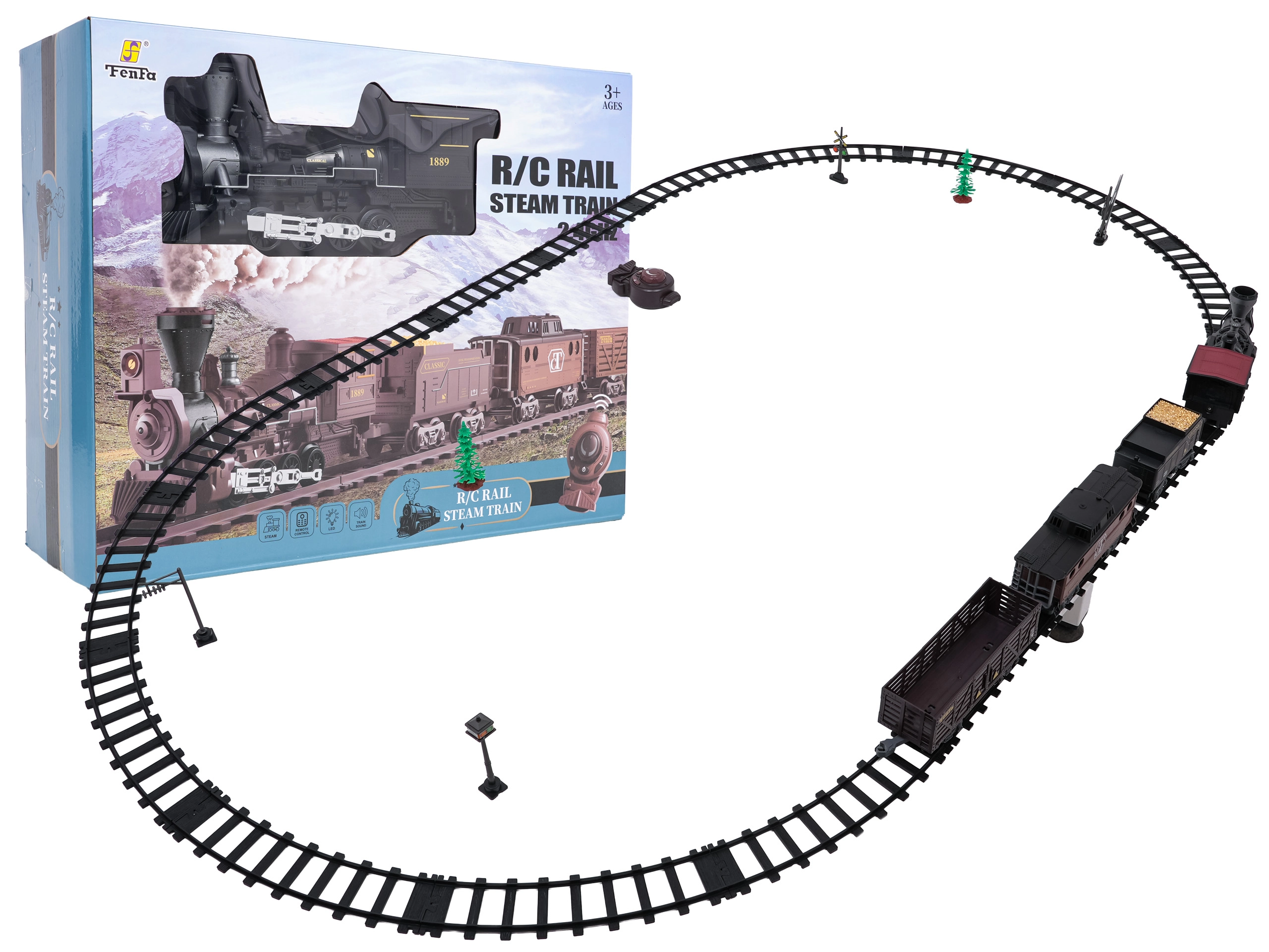 Daljinsko upravljanje na frekvenciji 2,4 GHz osigurava stabilnu vezu bez smetnji. Lako prebacite smjer vožnje (naprijed/nazad), zaustavite sastav ili pokrenite paru jednim gumbom. Set sadrži lokomotivu, putnički vagon, tender s ugljenom i pribor za jednostavno puštanje u rad.