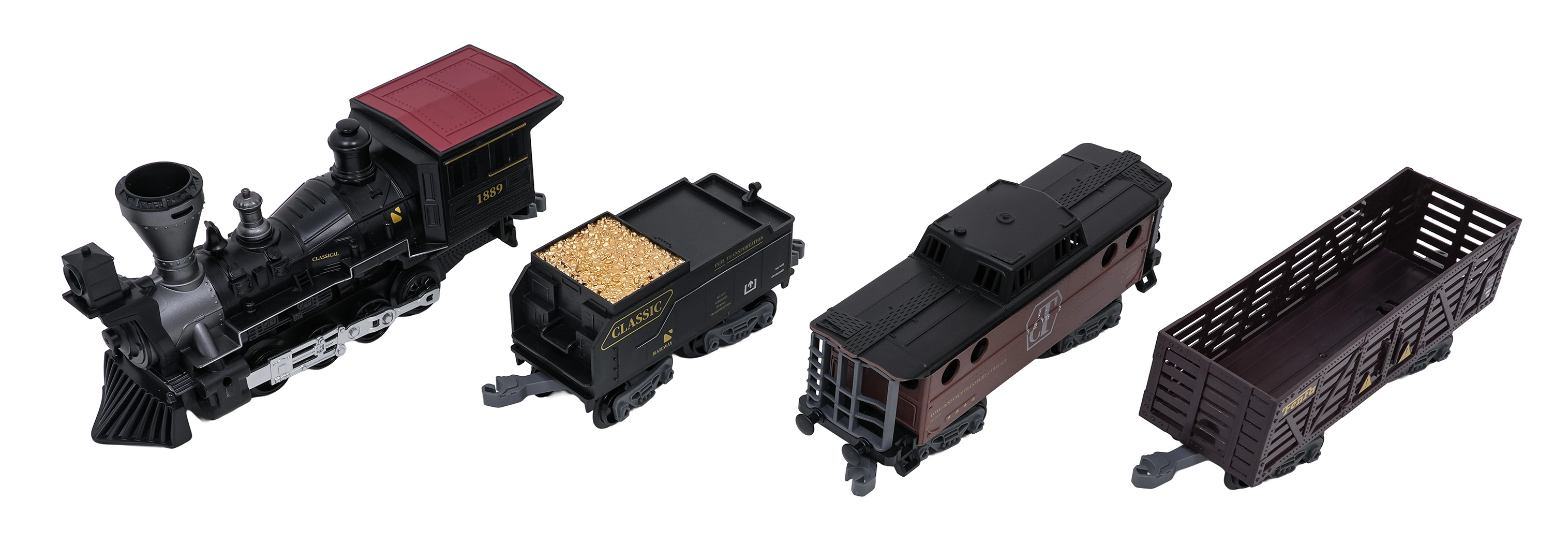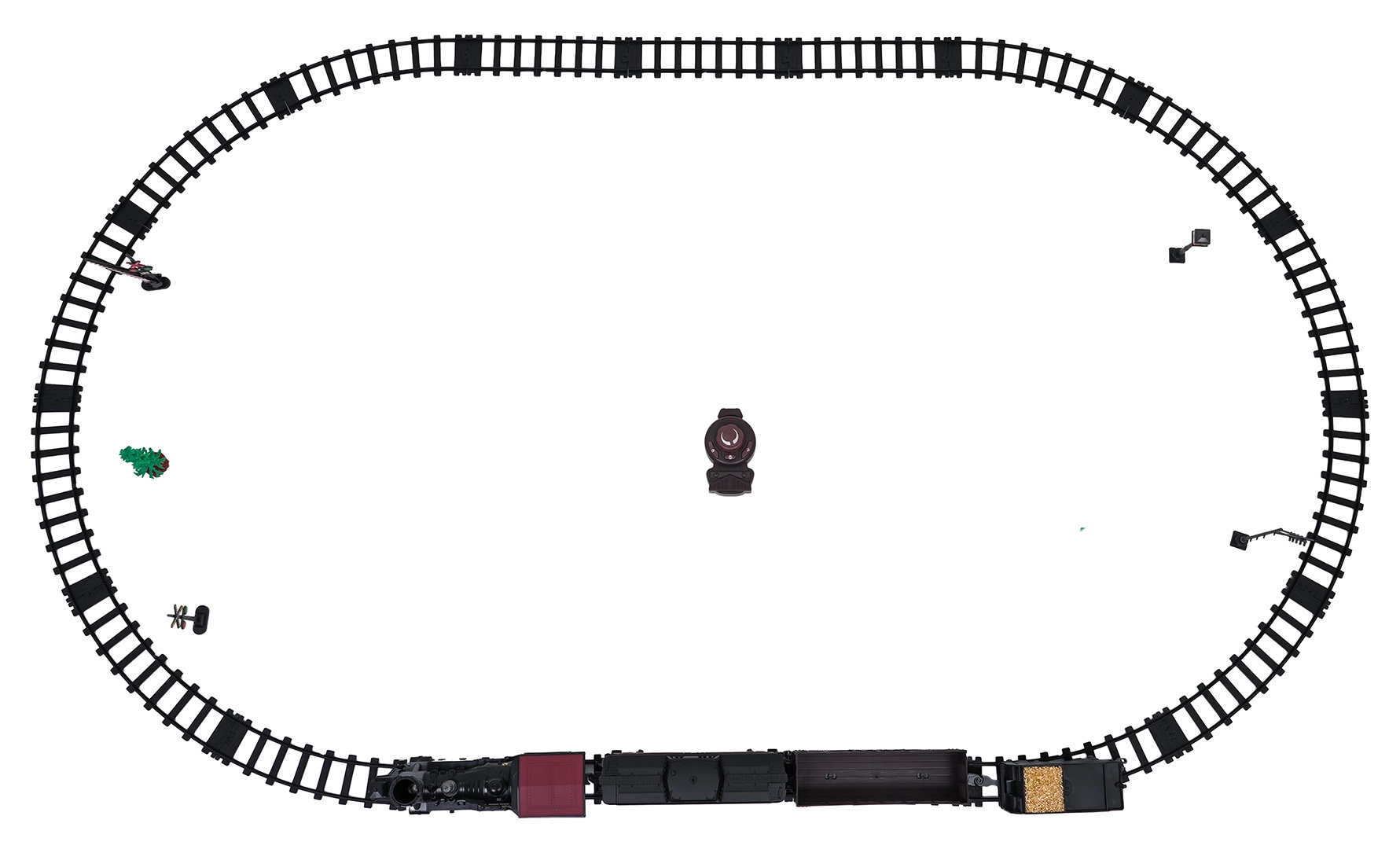 - lokomotiva, putnički vagon, tender s ugljenom, odvijač, pipeta za vodu, tračnice i dodaci