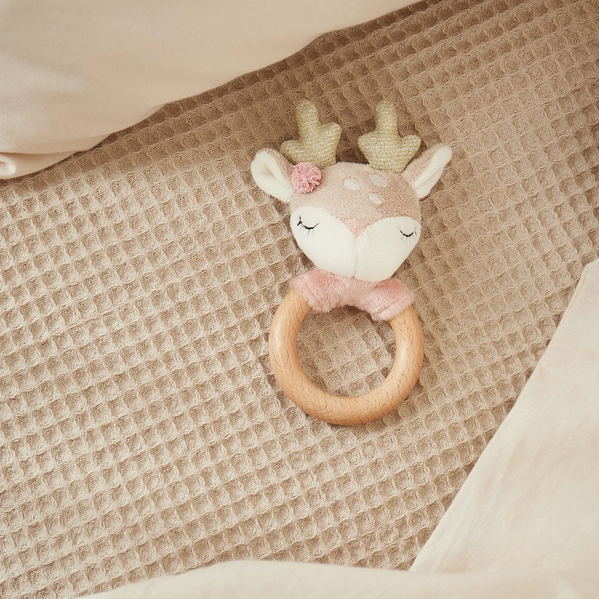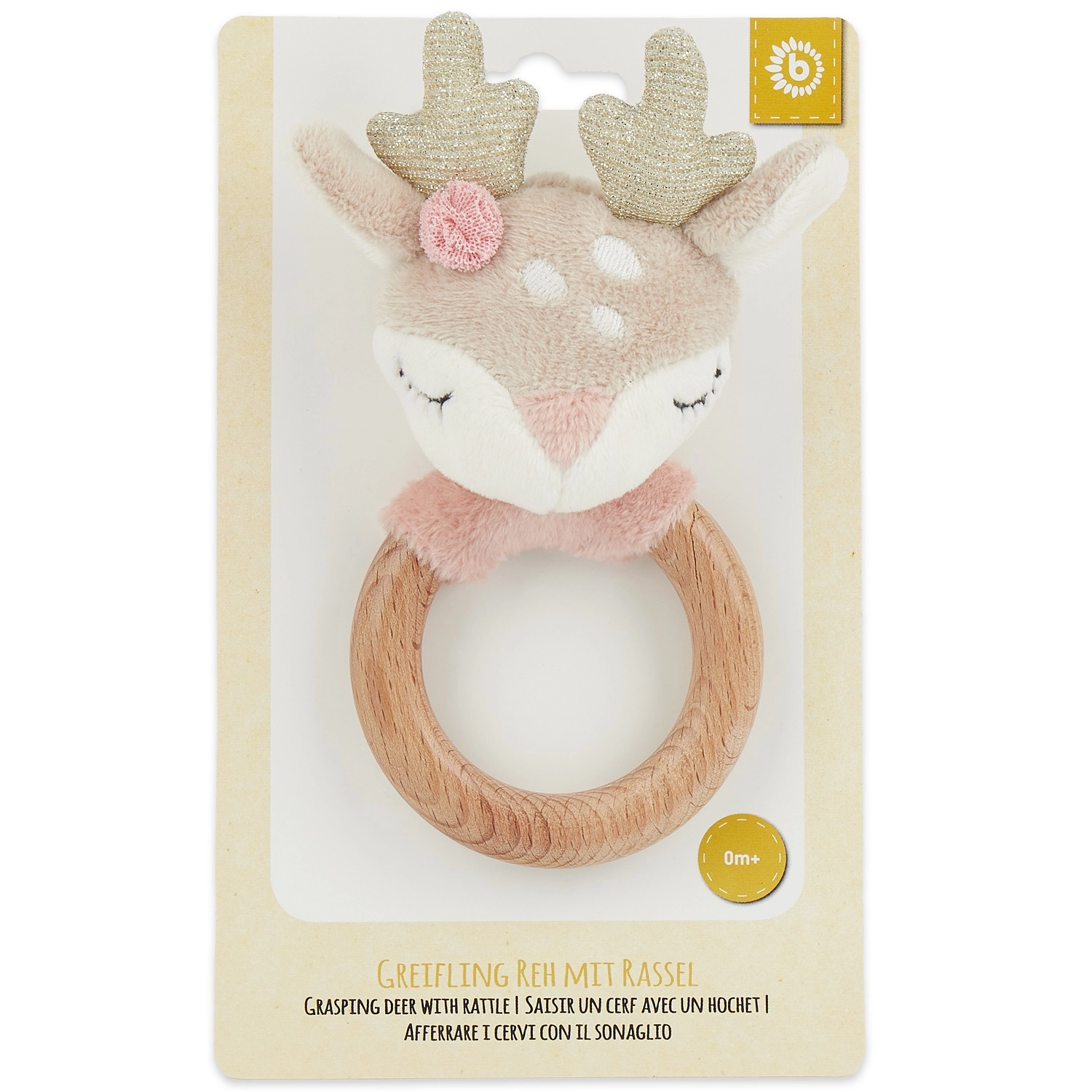 Ova multifunkcionalna motorička igračka spaja tri omiljene funkcije – zvečku, hvatalicu i grizalo. Drveni prsten je gladak, ugodan za držanje i prikladan za grickanje, dok mekana plišana glavica laneta nudi umirujući taktilni doživljaj. Nježno zveckanje prirodno potiče znatiželju i razvija koordinaciju oko–ruka.