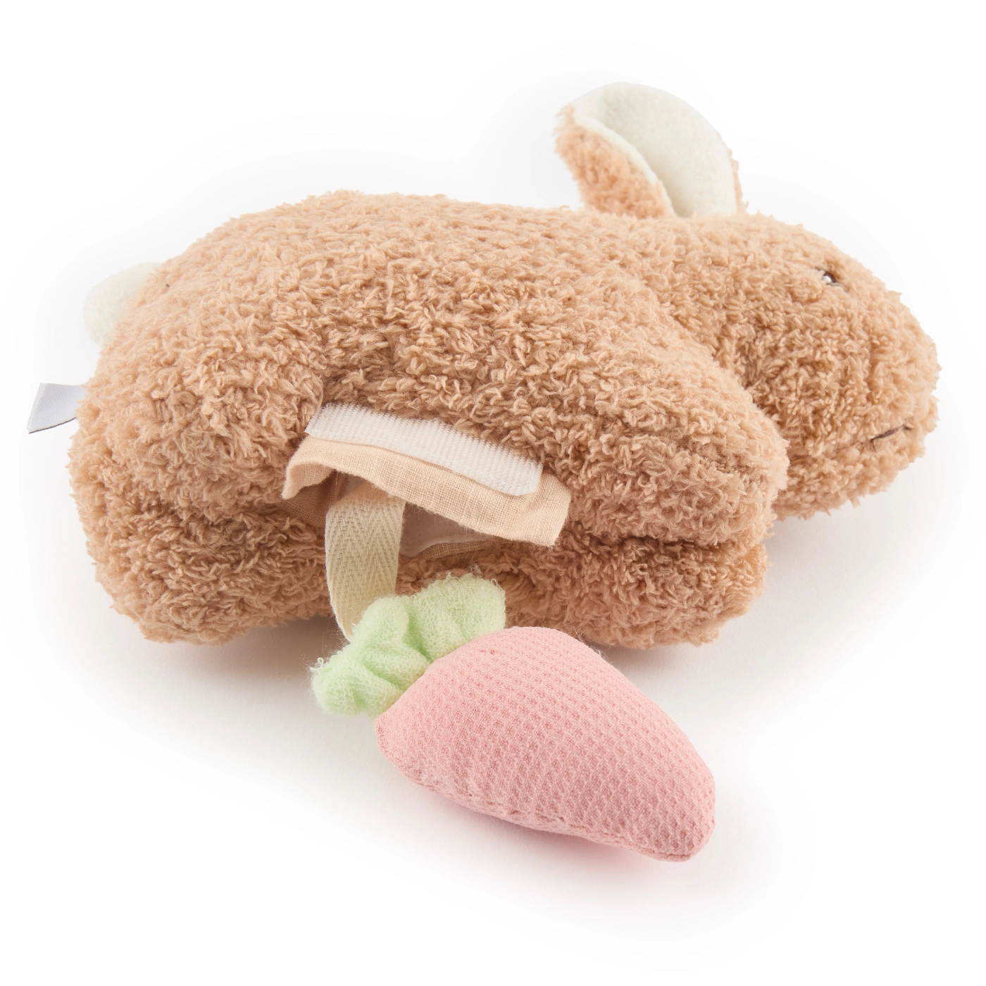 Izvadiva mrkvica u zečjem trbuščiću nježno šušti pri stisku i motivira bebu na istraživanje, hvatanje i ponovno otkrivanje.