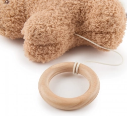 Zeko je izrađen od mekanog poliesterskog pliša, dobro pristaje dječjim ručicama i jednostavno se održava. Zahvaljujući tekstilnoj omčici igračku brzo i sigurno pričvrstite na krevetić, kolica ili autosjedalicu. Drveni prsten služi za navijanje mehanizma i kao lako prihvatljiva ručkica za male prstiće.