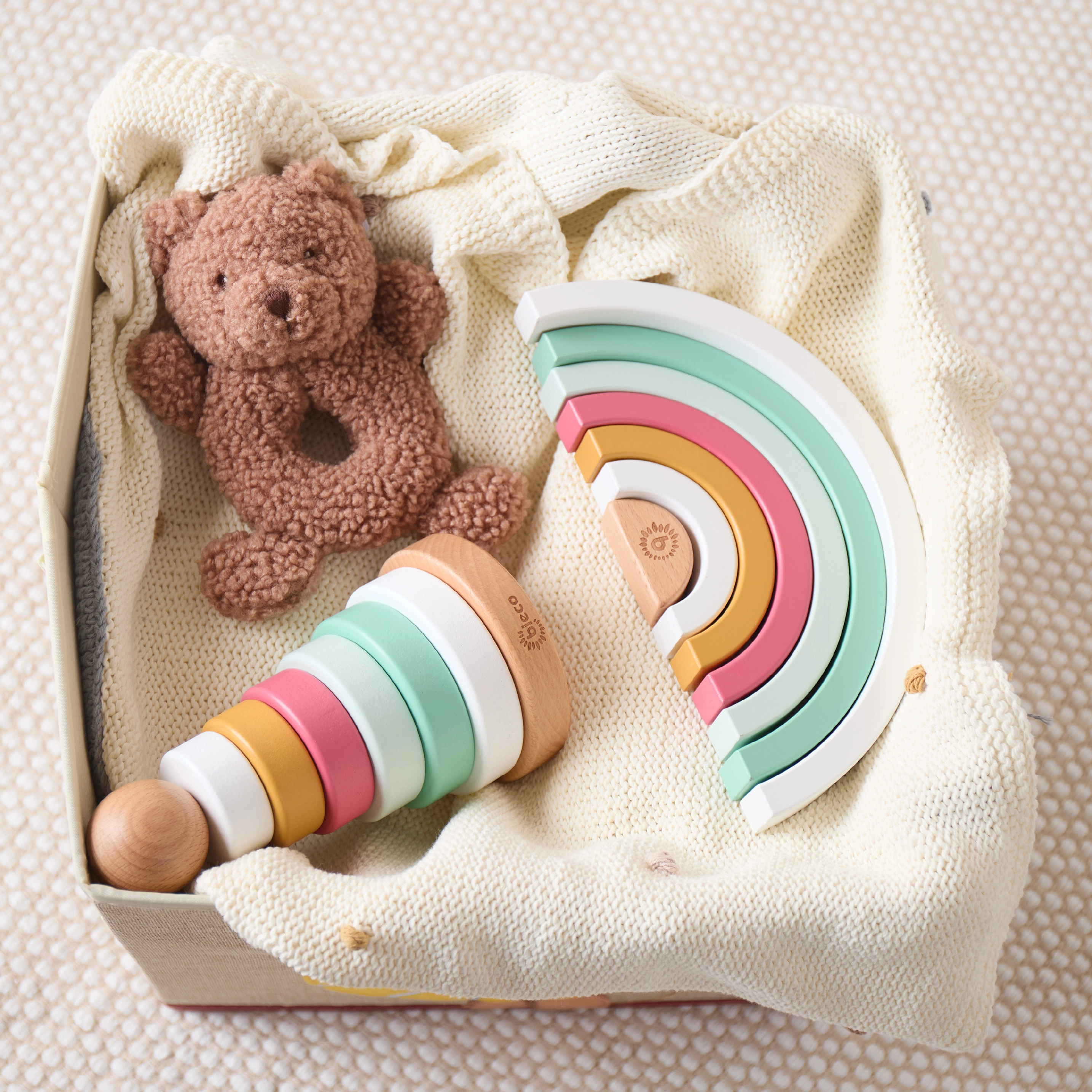 Sedam lukova različitih veličina motivira djecu na hvatanje, slaganje i balansiranje, čime prirodno jačaju finu motoriku i koordinaciju ruka–oko.