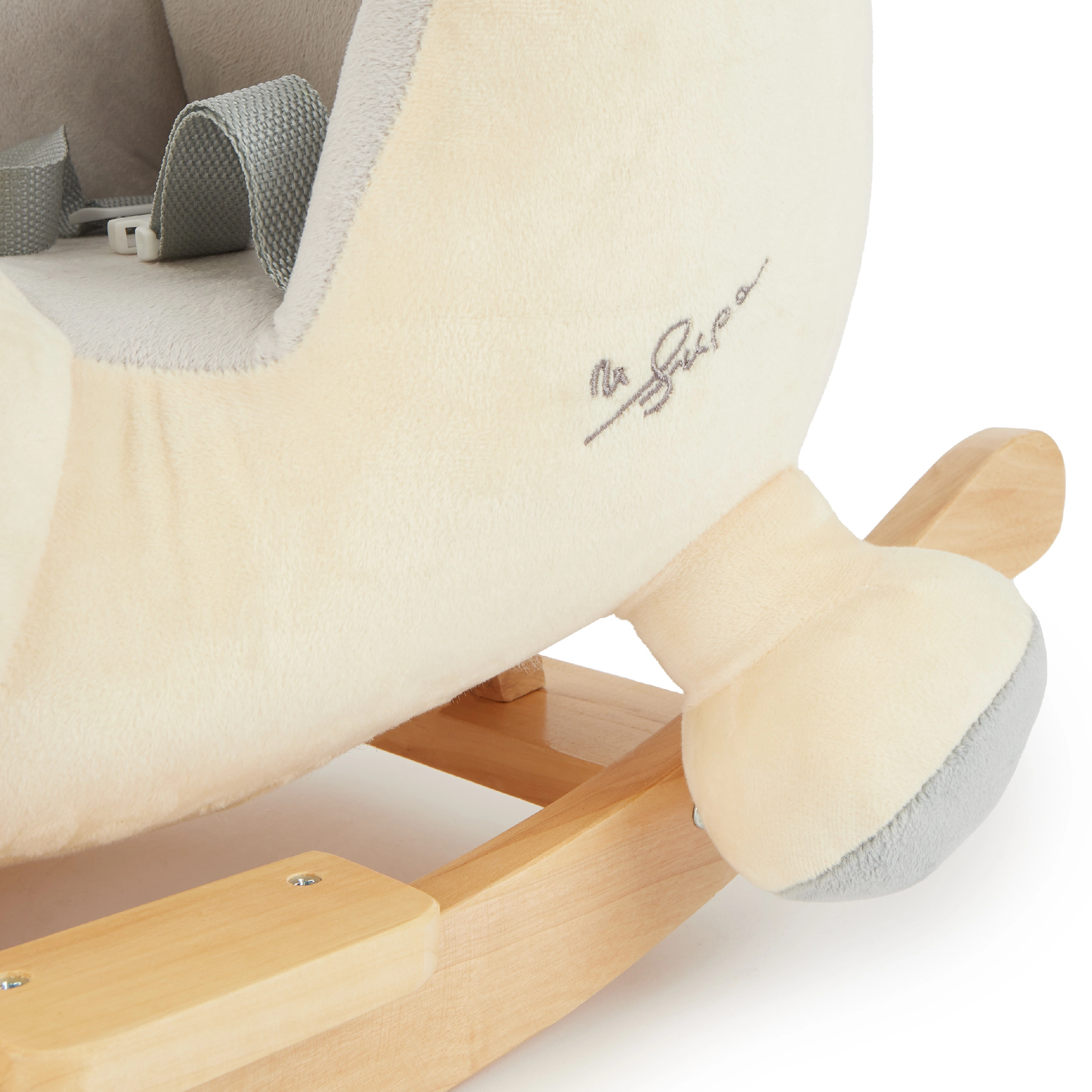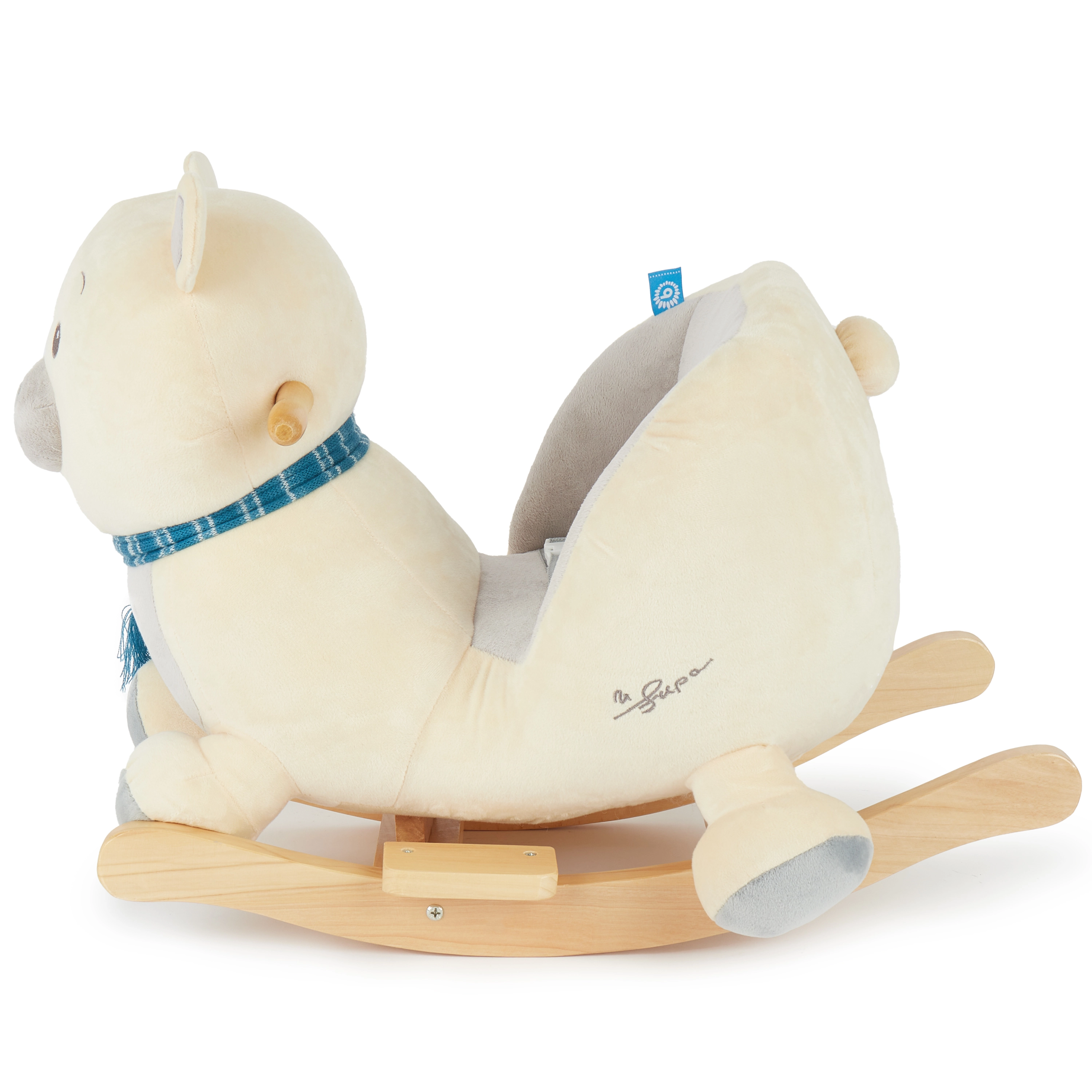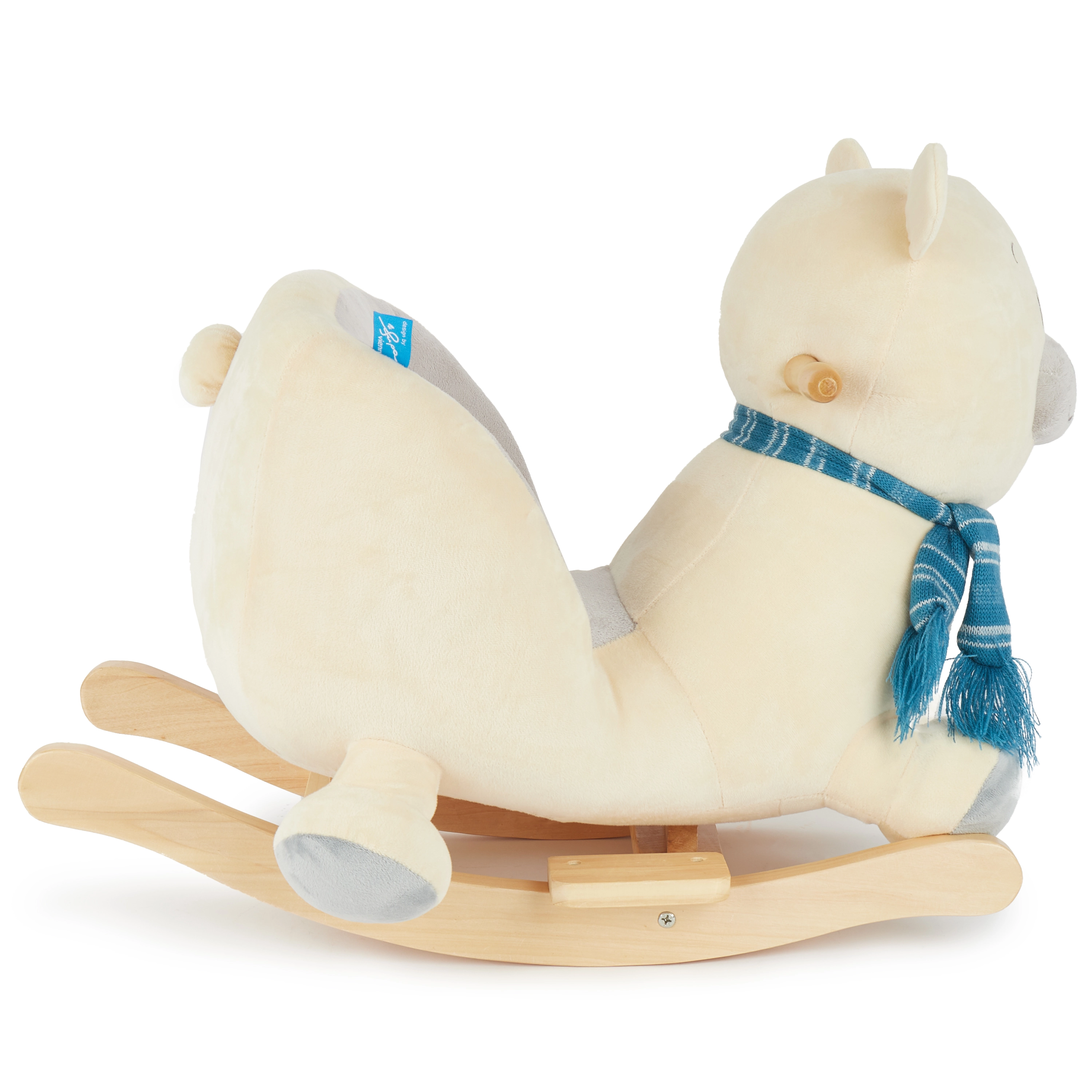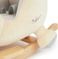 Masivna drvena baza sa zaštitom od prevrtanja i mekano, udobno podstavljeno sjedalo sa sigurnosnim pojasom pružaju maksimalnu sigurnost i za najmlađu djecu. Mekana plišana površina osigurat će da djeca brzo zavole svog novog prijatelja.