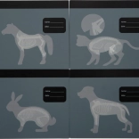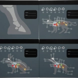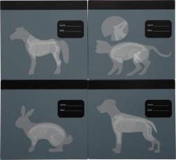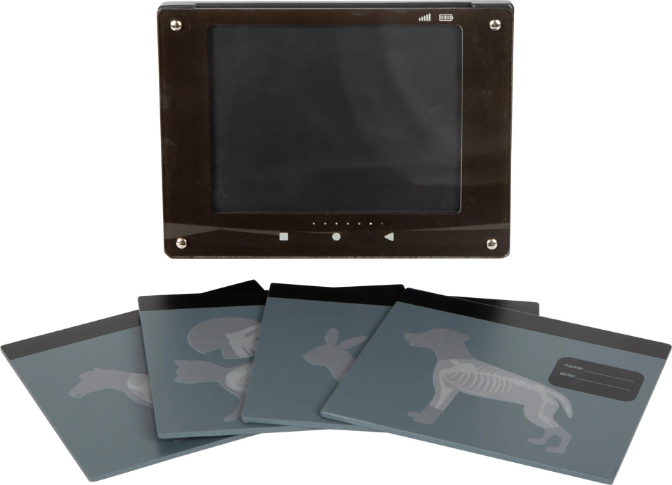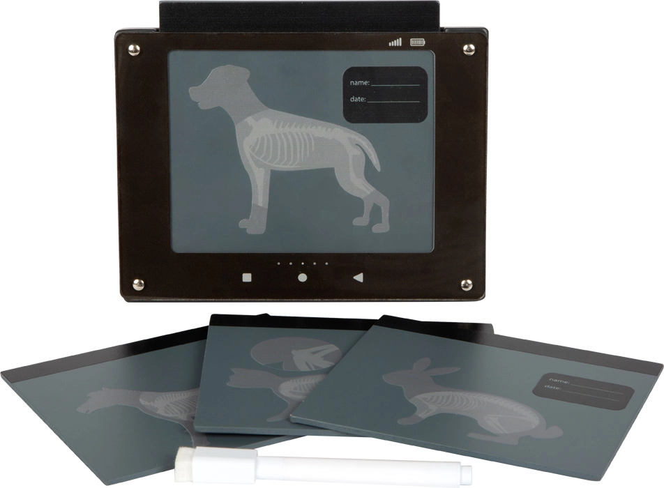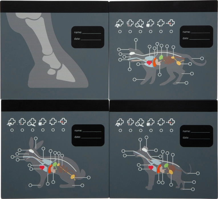 Interaktivni „rendgen” s prozirnim karticama životinja (pas, mačka, zec, konj) potiče maštu i na razigran način objašnjava građu tijela. Polje za upis omogućuje ime pacijenta i datum pregleda.