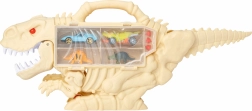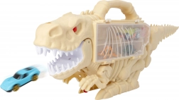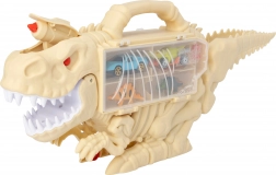 Zabavan set za male trkače: pucajući dinosaurus s autićima duljine 47 cm služi kao prijenosni kofer, organizator za autiće i ujedno akcijska staza s izbacivanjem. Sadrži 2 auta i 2 figurice dinosaura, ima bočnu stranu na otvaranje s pretincima, podiziv rep kao stazu i raketni bacač s gumbom za dodatnu akciju.