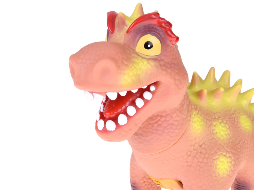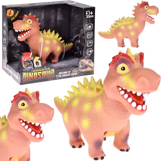 Otkrijte zabavnu figuricu dinosaura sa zvučnim efektima koja potiče sate kreativne igre. Tijelo je izrađeno od tvrde gume s detaljnom teksturom koja podsjeća na dinosaurovu kožu, izraženi zubi i leđni šiljci naglašavaju realističan izgled. Dovoljno je pomaziti dinosaura ispod brade i oglasit će se moćna rika.