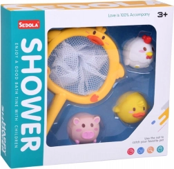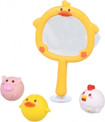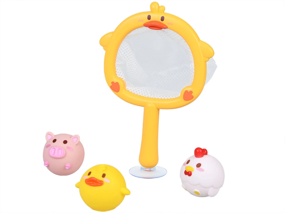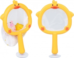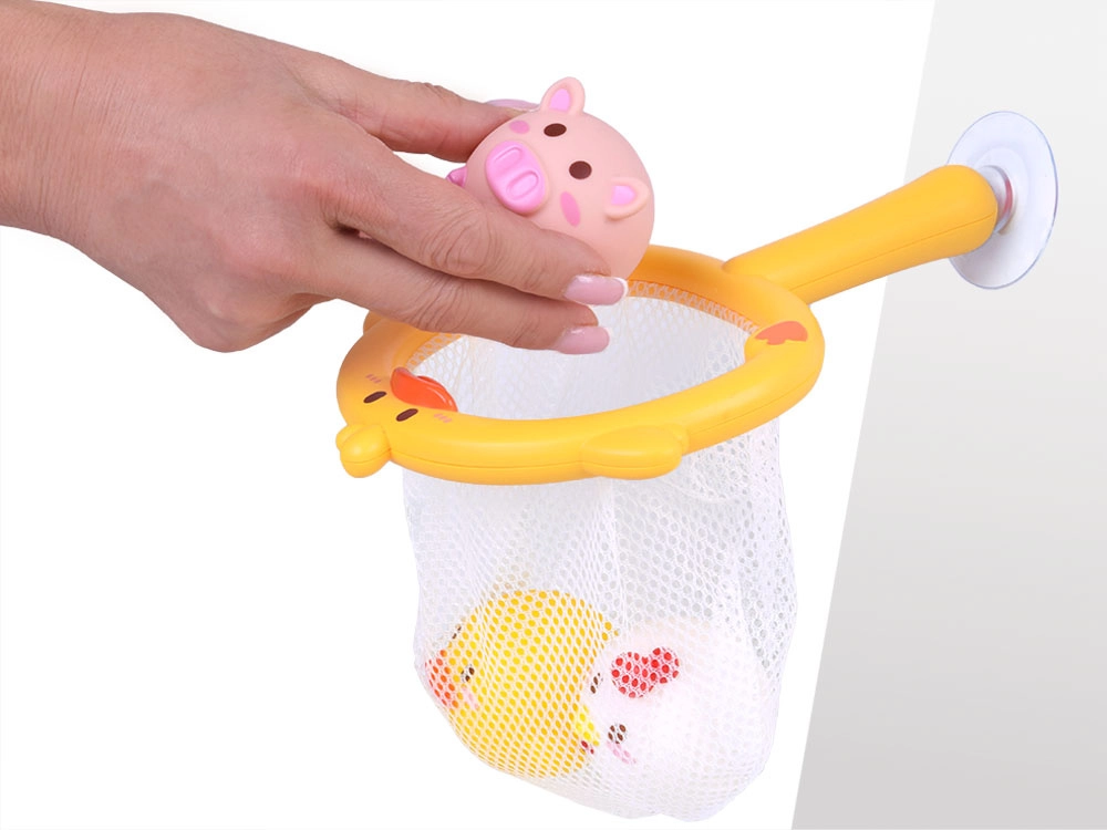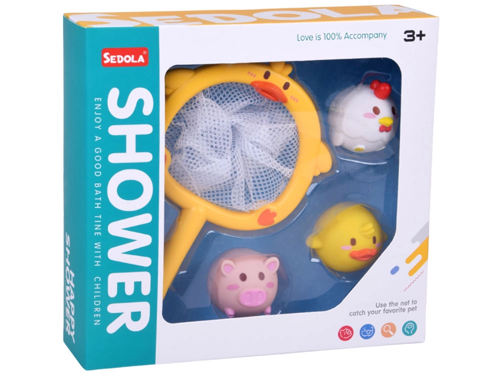Ovaj preslatki set za kupanje pretvara svako kupanje u zabavnu igru. Djeca mogu pomoću mrežice u obliku pačića loviti plutajuće životinjice i trenirati finu motoriku, koordinaciju oko–ruka i strpljenje. Vakuumska čašica na dršci omogućuje pričvršćivanje mrežice na glatku površinu kade ili pločica, pa igračke nakon kupanja lako presuše i ostanu uredno posložene.
