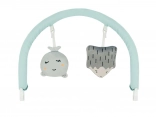Odvojiva prečka s dvjema mekanim igračkama potiče vizualno praćenje, hvatanje i koordinaciju ruka–oko.