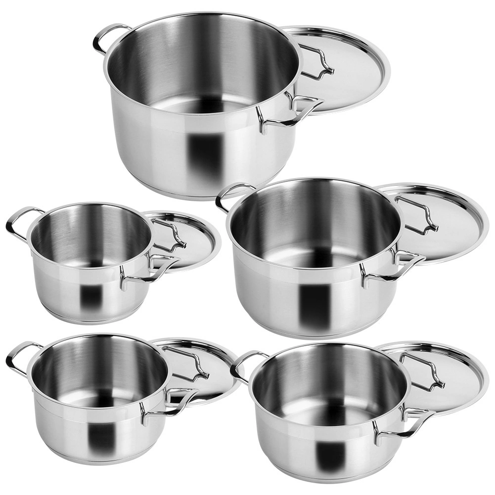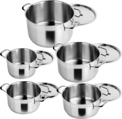 Set ANETT nudi 10 dijelova – pet lonaca s precizno pristajućim poklopcima od nehrđajućeg čelika – u najpopularnijim veličinama za svakodnevno kuhanje, pirjanje te pripremu umaka i juha. Kvalitetni nehrđajući čelik 304 (18/10) s mat površinom i elegantnim sjajnim rubom jamči izdržljivost, higijenu i bezvremenski izgled u svakoj kuhinji.