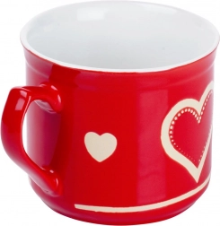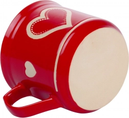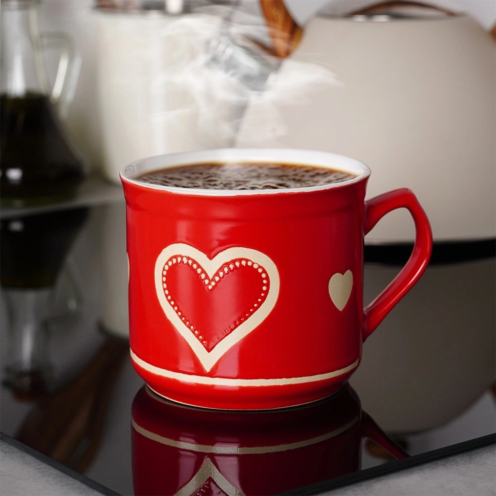Velika keramička šalica zapremine 650 ml u crvenoj boji sa stilskim dekorom srca savršena je za svakodnevno ispijanje kave ili čaja. Ima udobnu ručku, ravno dno za stabilnost i jednostavno zagrijavanje, prikladna je za mikrovalnu i perilicu posuđa te će razveseliti i kao dekorativni detalj u kuhinji.