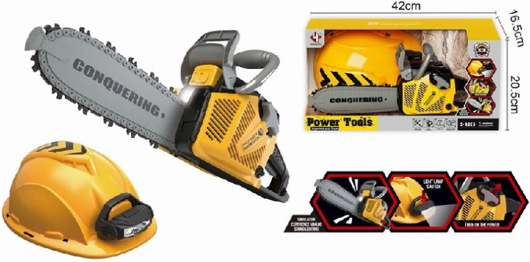 Igračka motorna pila s kacigom i svjetiljkom za male drvosječe