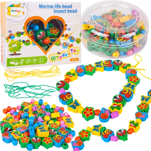 Kreativni set drvenih perlica s motivom bubamare razveselit će djecu i odrasle. Sadrži duge uzice i mnoštvo šarenih perlica za nizanje. Potiče finu motoriku, kreativnost i strpljivost pri izradi originalnih ogrlica, narukvica ili dekoracija.