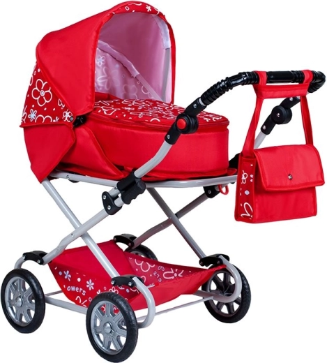 Stilska dječja kolica za lutke 2u1 NEW BABY Monika u crvenoj boji razveselit će svaku malu mamu. Nude duboku i sportsku verziju, laganu i izdržljivu metalnu konstrukciju, podesivu ručku te bogatu opremu – torbicu za sitnice, prijenosnu torbu za lutku i veliku košaru za kupnju. Naravno, tu su i sigurnosna blokada protiv samosklapanja te klasično opruženje za udobnu vožnju.