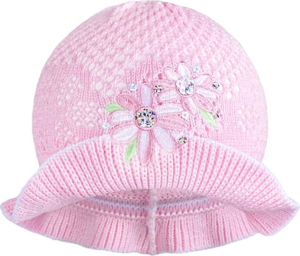 Stilni proljetni pleteni šeširić za bebe i malu djecu marke NEW BABY u nježnoj ružičasto-bijeloj kombinaciji. Izrađen je od 100% pamuka koji je mekan, prozračan i elastičan. Krase ga simpatičan motiv cvjetića i šareni rub, a elastičan materijal se udobno prilagođava opsegu glave cca 40–50 cm.