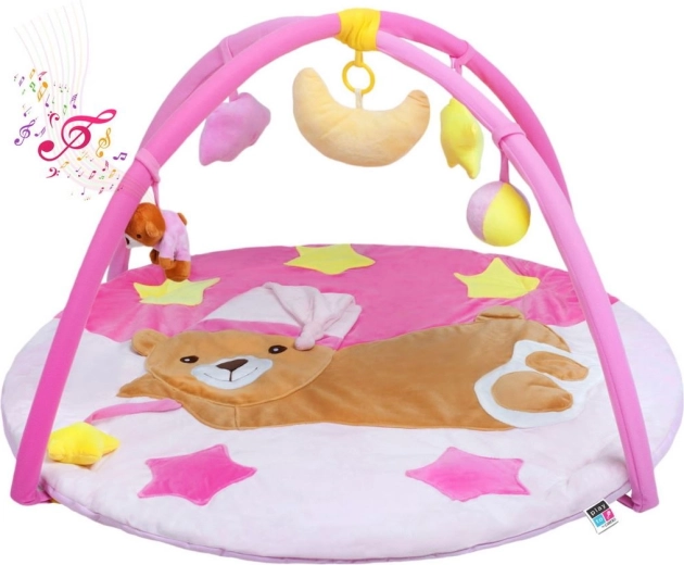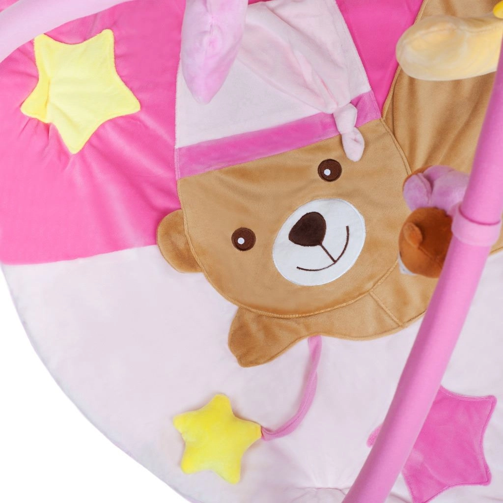 Ovo originalno edukativno igralište u ružičastoj boji s preslatkim medom osmišljeno je kako bi potaknulo razvoj vida, dodira i sluha. U mjesečiću je skriven glazbeni modul koji se pritiskom aktivira i reproducira ugodne melodije, dok šumeći i pokretni dijelovi potiču dječju znatiželju. Mekana podstava osigurava maksimalnu udobnost i siguran prostor za prve korake u otkrivanju svijeta.