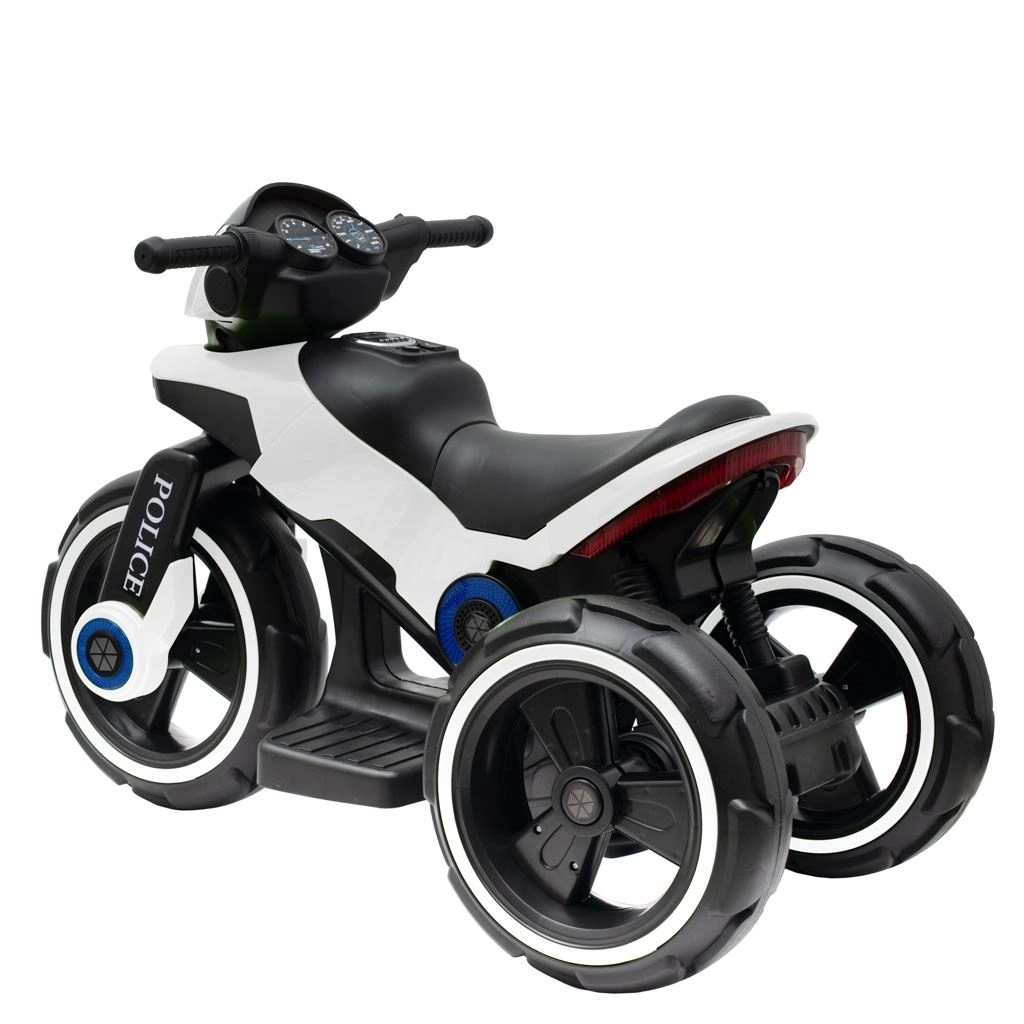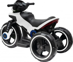 Stilizan dječji električni motor BABY MIX POLICE u bijeloj boji nudi sigurnu i stabilnu vožnju zahvaljujući širokim kotačima, udobnom sjedalu i pogonu na oba stražnja kotača. Dva motora 6V/24W osiguravaju glatko pokretanje, vožnju naprijed i nazad upravljate prekidačem, a kočenje se odvija otpuštanjem pedale. Tu su i LED svjetla, zvučni efekti i reprodukcija glazbe putem USB/MP3 – idealan izbor za male policajce od 3 do 7 godina.