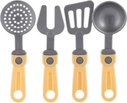 Set uključuje tri lonca s poklopcima i četiri različita kuhinjska alata, idealno za različite vrste imaginativnih kulinarskih aktivnosti.