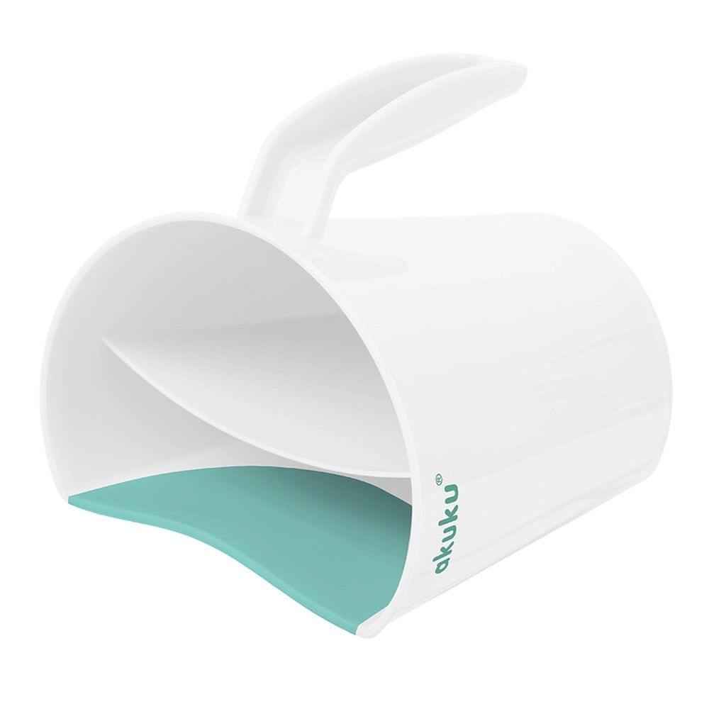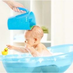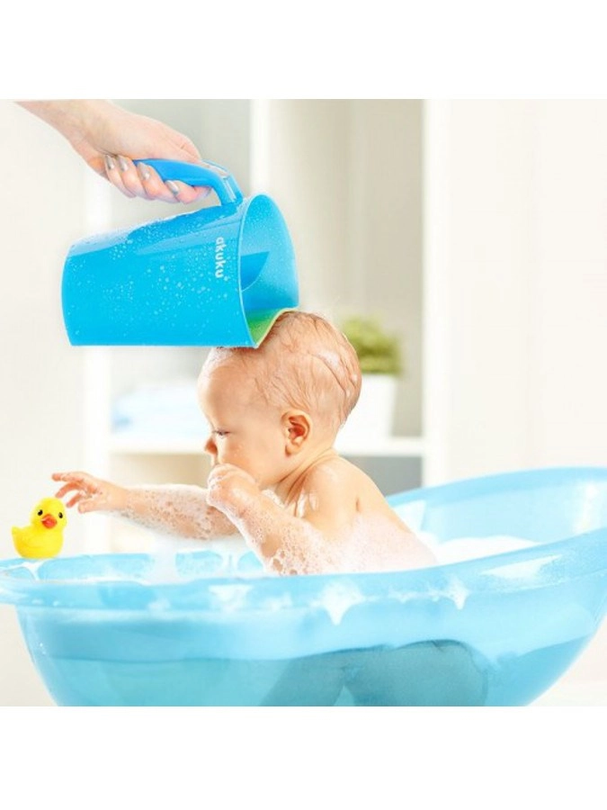 Praktična dječja posuda za ispiranje kose AKUKU olakšava kupanje bez suza. Zahvaljujući mekom elastičnom rubu voda ne curi u oči, dvostruka komora osigurava temeljito ispiranje, a ergonomska ručka udobno izlijevanje. Prikladno od rođenja, bez BPA.