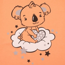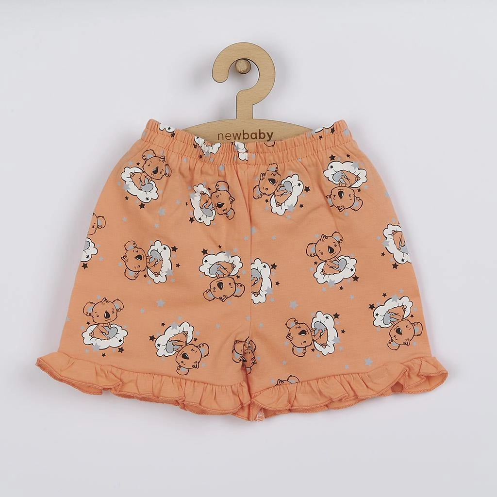 Ljetna pidžama New Baby Dream u nježnom lososovom tonu dizajnirana je za maksimalnu udobnost i nježan izgled. Laganа majica s volanima i slatkim printom medvjedića na oblačiću upotpunjena je kratkim hlačama s cjeloplošnim tiskom medvjedića i volanima na nogavicama. Zahvaljujući 100% pamuku, pidžama je prozračna, nježna prema osjetljivoj dječjoj koži i izvrsna i kao ljetna kućna ili odjeća za slobodno vrijeme.