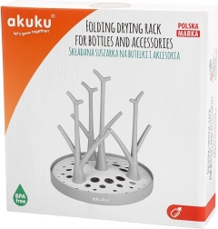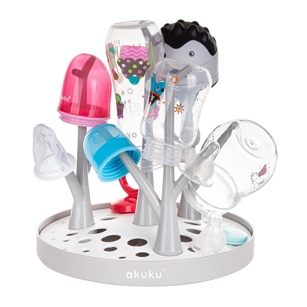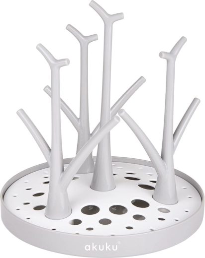 Stilizan i funkcionalan stalak Akuku u obliku stabalaca nudi dovoljno mjesta za sušenje dječjih bočica, duda, slamki i drugih sitnih komponenti. Vertikalni raspored grančica osigurava učinkovitu cirkulaciju zraka i brzo sušenje bez zaostajanja vode. Posebno oblikovano dno usmjerava vodu u jednu točku, pa radna ploča ostaje čista.
