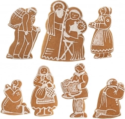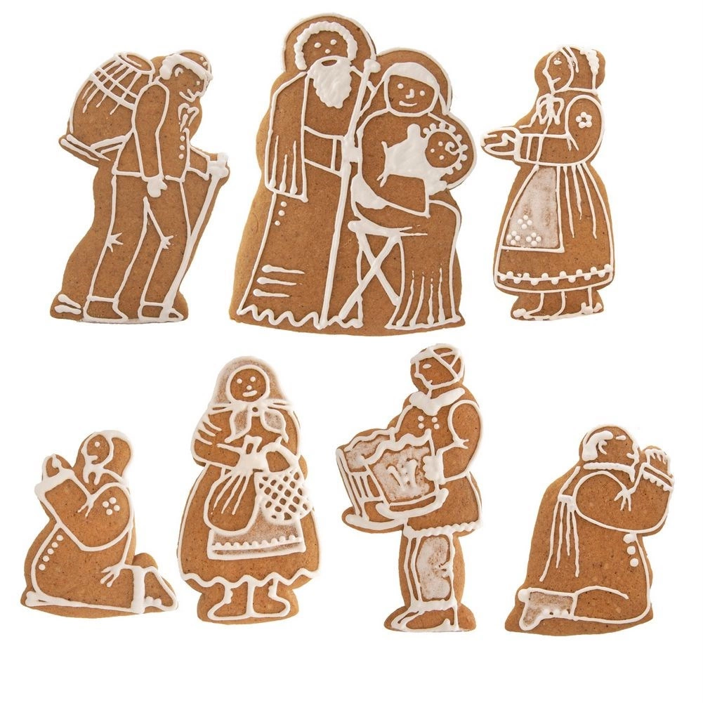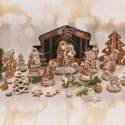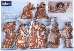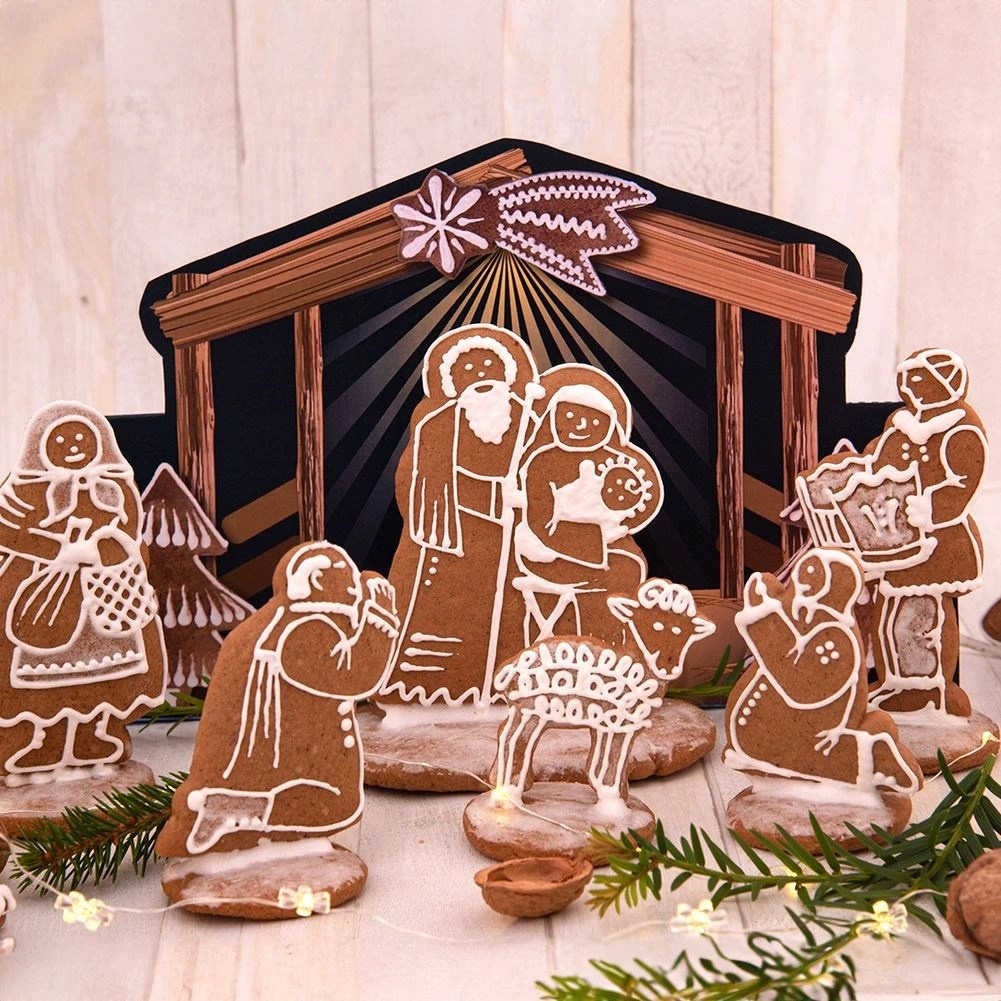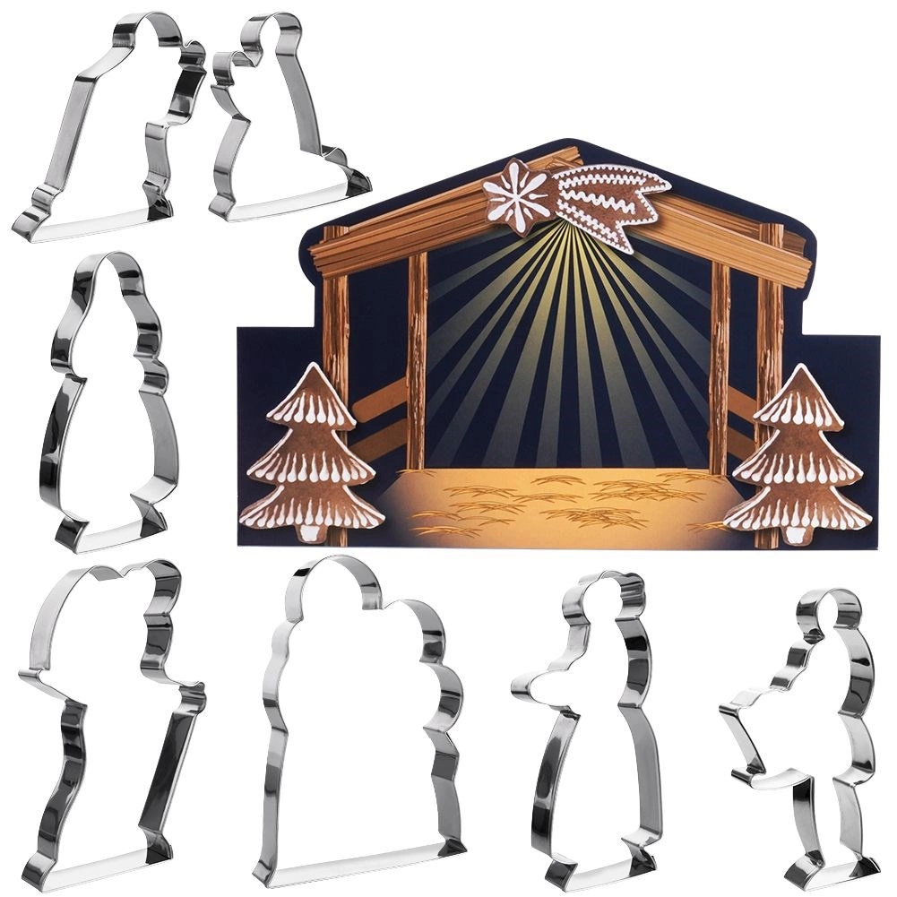 Uz set božićnih rezača jednostavno ćete izrezati precizne oblike figurica i životinjica iz jaslica te stvoriti originalnu božićnu dekoraciju i ukusne slastice. Širina pojedinih kalupa je cca 2–9 cm, a duljina 7–12 cm – idealno za medenjake i tijesto za kekse. Šarena kartonska pozadina služi za dovršavanje cijele scene.