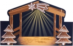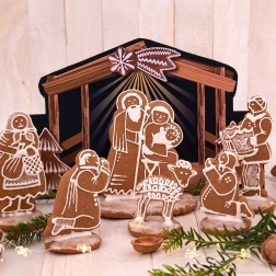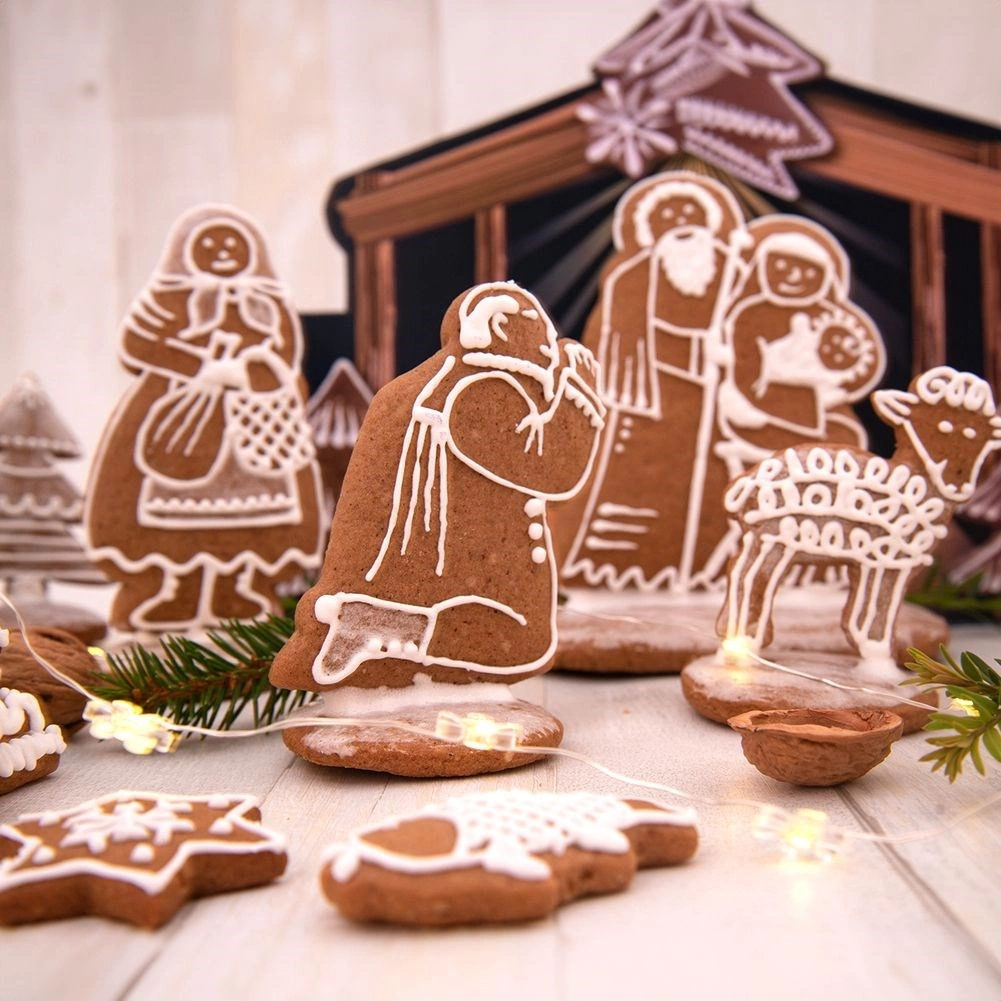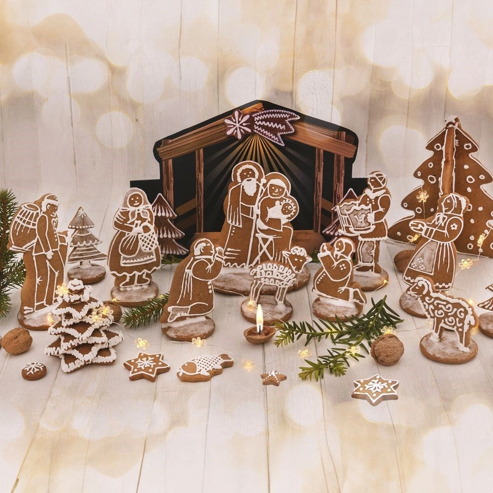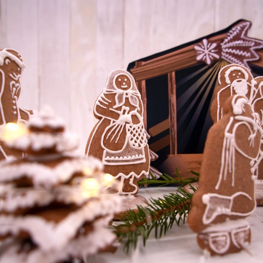 Set uključuje likove jaslica i ukrasnu pozadinu, pa nakon pečenja lako stvarate dojmljivu božićnu dekoraciju za stol ili prozorsku dasku.