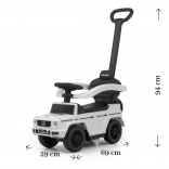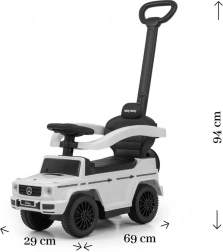 Stilska dječja guralica s licencom MERCEDES nadahnuta modelom G‑Class donosi sigurnu vožnju i puno zabave za djecu od 12 do 36 mjeseci. Nudi vodilicu za roditelje, okretna prednja kola, široko sjedalo s pretincem za pohranu i zvučne efekte na volanu. Zahvaljujući odvojivim bočnim naslonima, osloncima za noge i vodilici lako se pretvara iz vozila s pratnjom u samostalnu guralicu.
