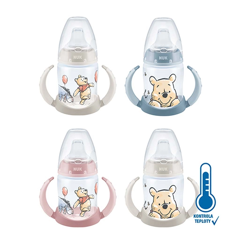 Učeća dječja bočica NUK s motivom MEDO POOH pomaže djeci savladati prijelaz na samostalno pijenje. Zahvaljujući integriranom indikatoru temperature sigurno ćete prepoznati je li napitak previše vruć – plava traka posvijetli kada je temperatura visoka. Bočica ima meki silikonski nekapajući nastavak, ergonomski oblik i protuklizne ručkice za lako držanje. Ne sadrži BPA i lako se rastavlja i čisti.