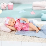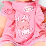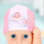 Ružičasti kupaći kostim s plavim šavovima i veselim motivima daje lutki jedinstven izgled.