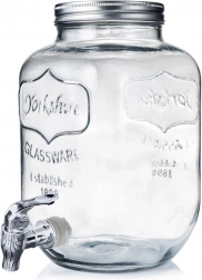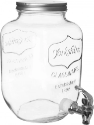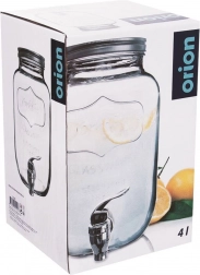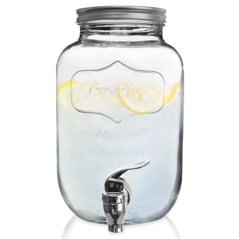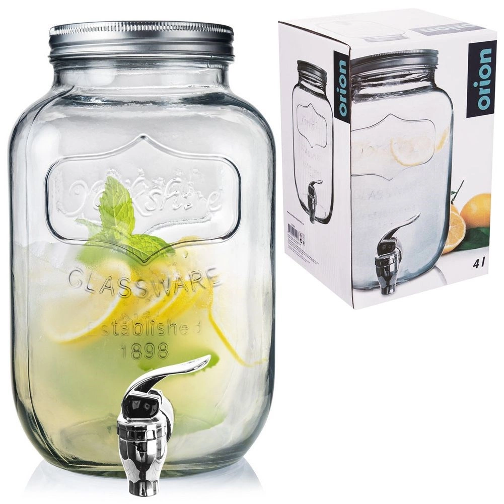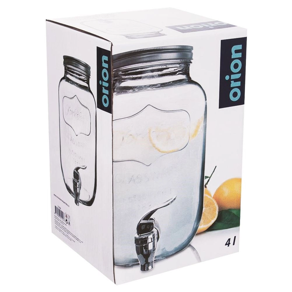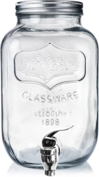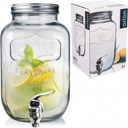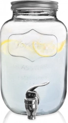 Stilski stakleni dispenzer za napitke zapremine 4 l s metalnim poklopcem i praktičnim pipcem za jednostavno točenje. Idealan za limunadu, voćne vode, punč ili iced tea. Ima široki grlo za lako punjenje i čišćenje, sigurne materijale pogodne za kontakt s hranom i zatvorivi poklopac koji štiti napitak od insekata.