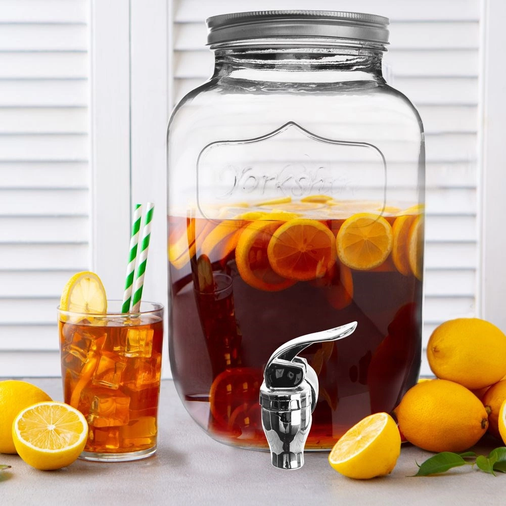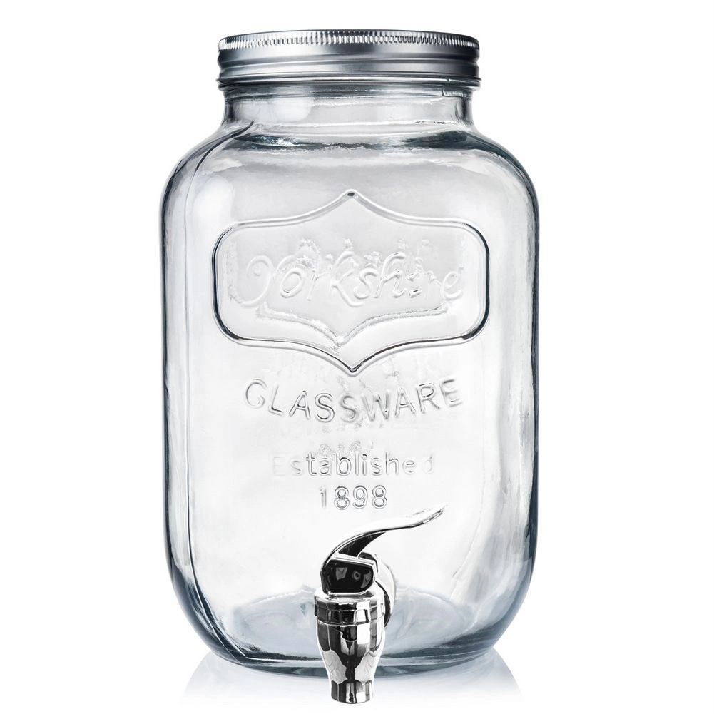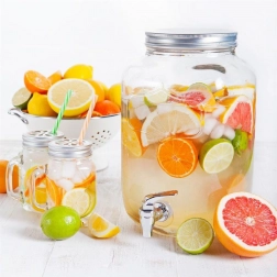Elegantni stakleni dispenzer s pipcem savršen je izbor za posluživanje osvježavajućih napitaka na vrtim proslavama, obiteljskim okupljanjima te u restoranima ili barovima. Prozirno staklo s reljefnim ukrasom lijepo ističe šarene kriške voća i kocke leda, dok metalni navojni poklopac održava napitak čistim i zaštićenim.