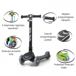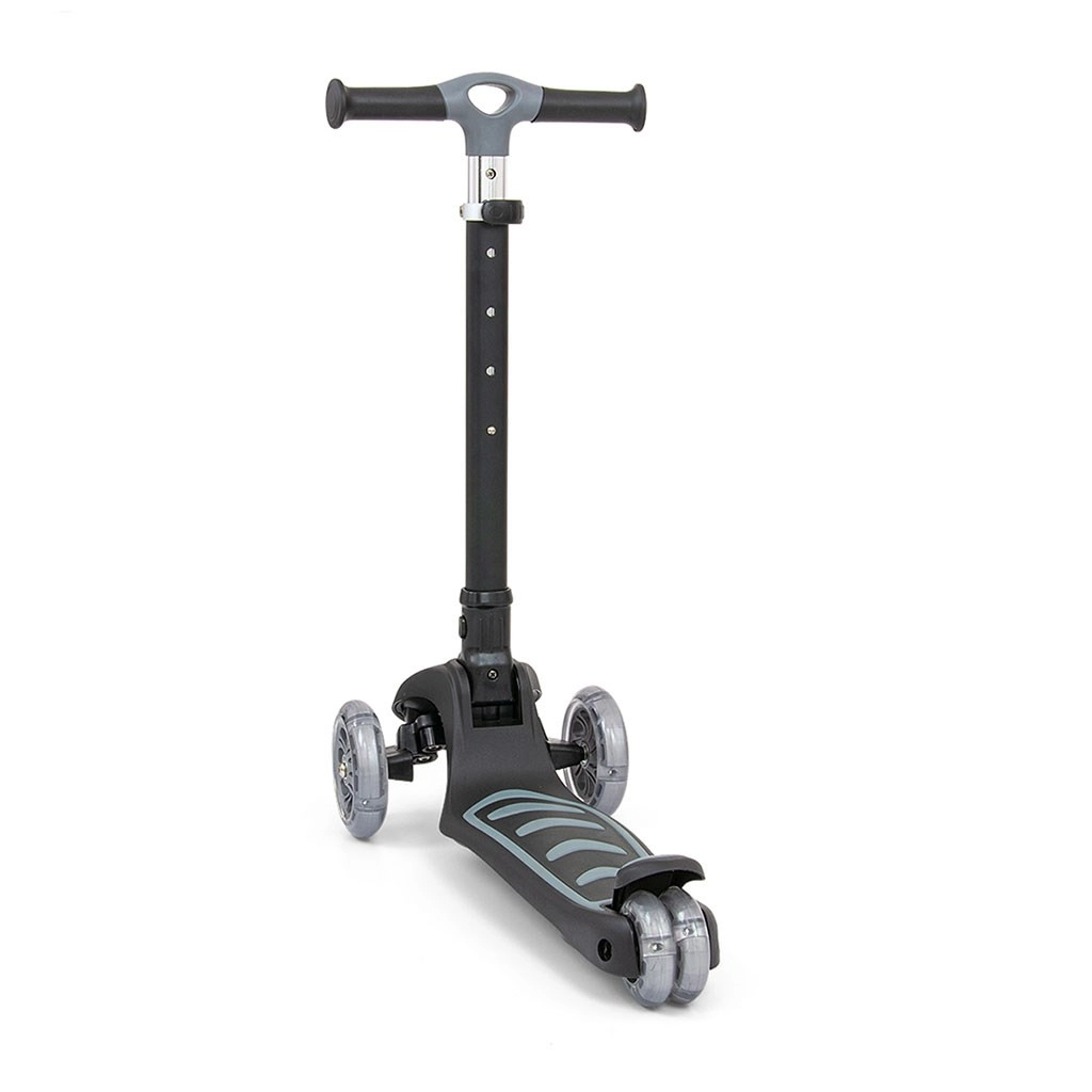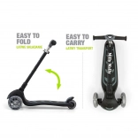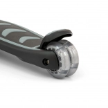 Velika prednost su tri kotača za maksimalnu stabilnost – sprijeda svjetleći PU kotači promjera 120 mm i novi dvostruki stražnji svjetleći kotač 80 mm s kočnicom na blatobranu. Mekane ručke, protuklizna platforma i ležajevi ABEC-7 osiguravaju udobnu, tihu i sigurnu vožnju.