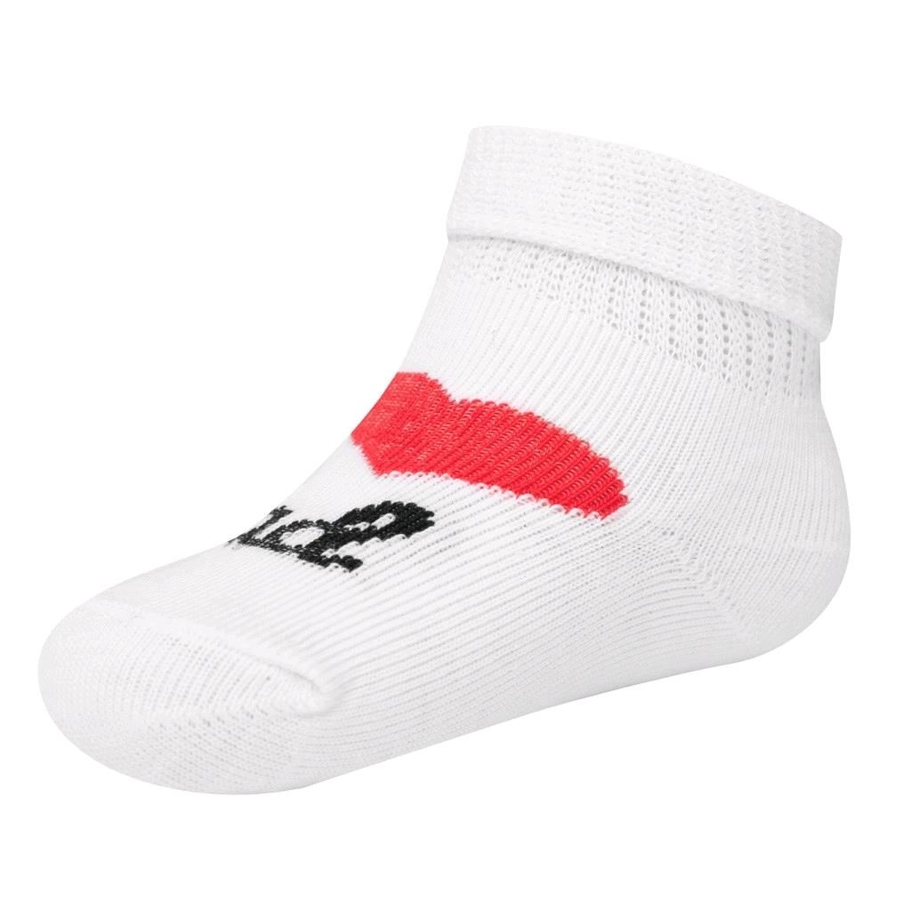 Ove bijele bebine čarapice s nježnim motivom I ♥ Mum i I ♥ Dad odličan su izbor za svaki dan. Mekani frotir i rebrasti rub osiguravaju da čarapice dobro stoje na nožici bez pritiska. Kvalitetan materijal je ugodan na dodir, prozračan i otporan na blijeđenje.