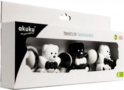 Crno-bijela zvečka Akuku s medvjedićima osmišljena je za najmlađu djecu te pomaže u razvoju vida, sluha i motorike. Kontrastne boje zaokupljaju bebu, nježno zveckanje umiruje i stimulira osjetila. Igračka je lagana, ugodna na dodir i jednostavna za održavanje čistoće.