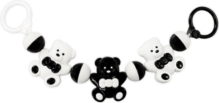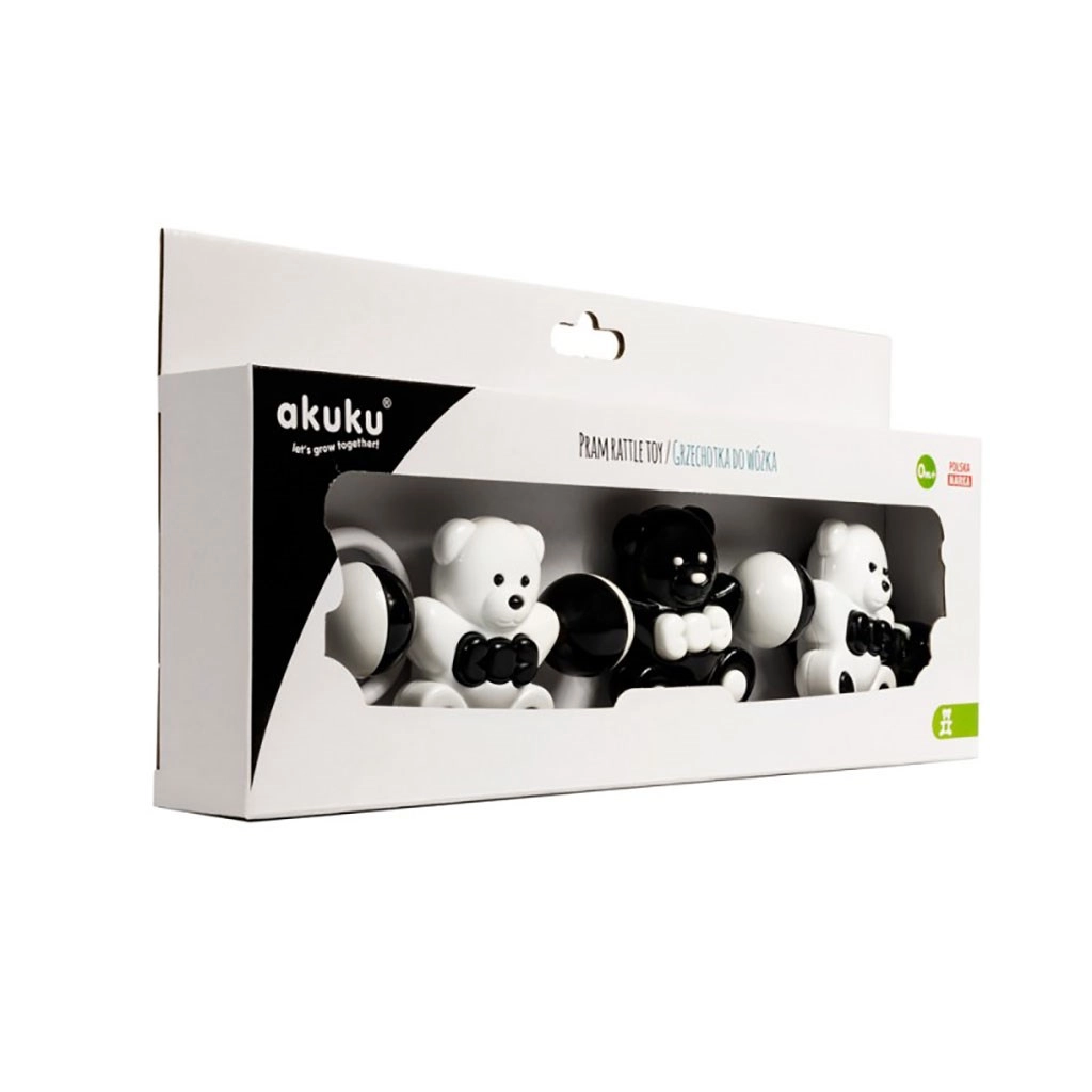 Slatka zvečka s motivom medvjedića brenda Akuku idealan je dodatak za kolica, dječji krevetić i autosjedalicu. Zahvaljujući crno-bijeloj izvedbi potiče vizualnu percepciju bebe i privlači pažnju nježnim zvukom. Jednostavno pričvršćivanje i kvalitetni materijali osiguravaju sigurno korištenje i dug vijek trajanja. Univerzalno pričvršćivanje omogućuje upotrebu kod kuće i na putu.