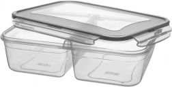 Praktična podijeljena kutija za hranu zapremnine 2 l s čvrstim poklopcem, četirima kopčama i silikonskom brtvom za savršenu nepropusnost. Zahvaljujući dvjema odvojenim pregradama okusi i mirisi ostaju odvojeni, bez BPA je, pogodna za perilicu posuđa, mikrovalnu pećnicu (bez poklopca), hladnjak i zamrzivač te podnosi temperature od -25 °C do +95 °C.