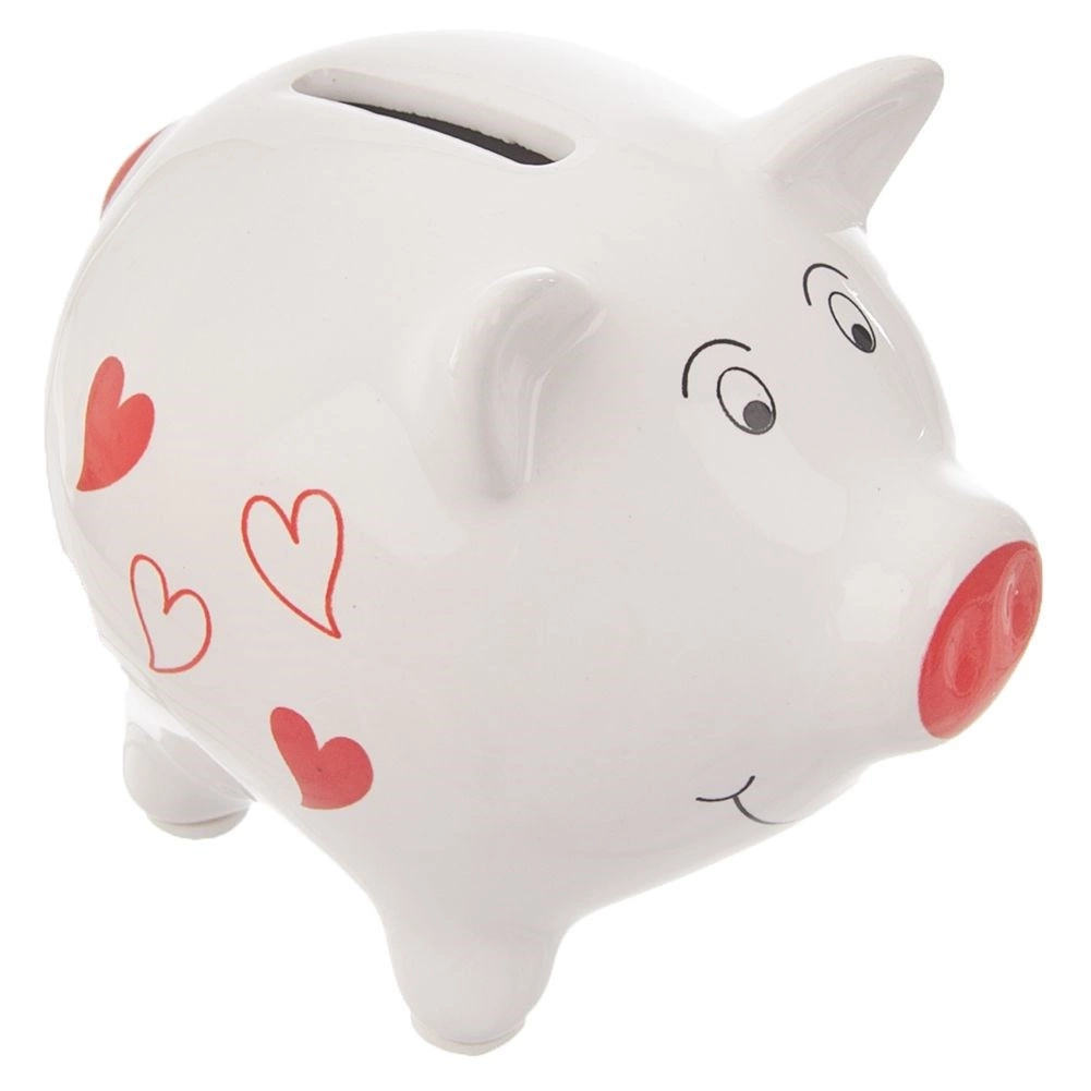 Keramička kasica-prasica odličan je izbor za djecu i odrasle koji žele započeti s redovitim odlaganjem kovanica i novčanica. Sjajna bijela glazura s crvenim srcima daje kasici razigran izgled koji se uklapa i u moderne i u dječje sobe.