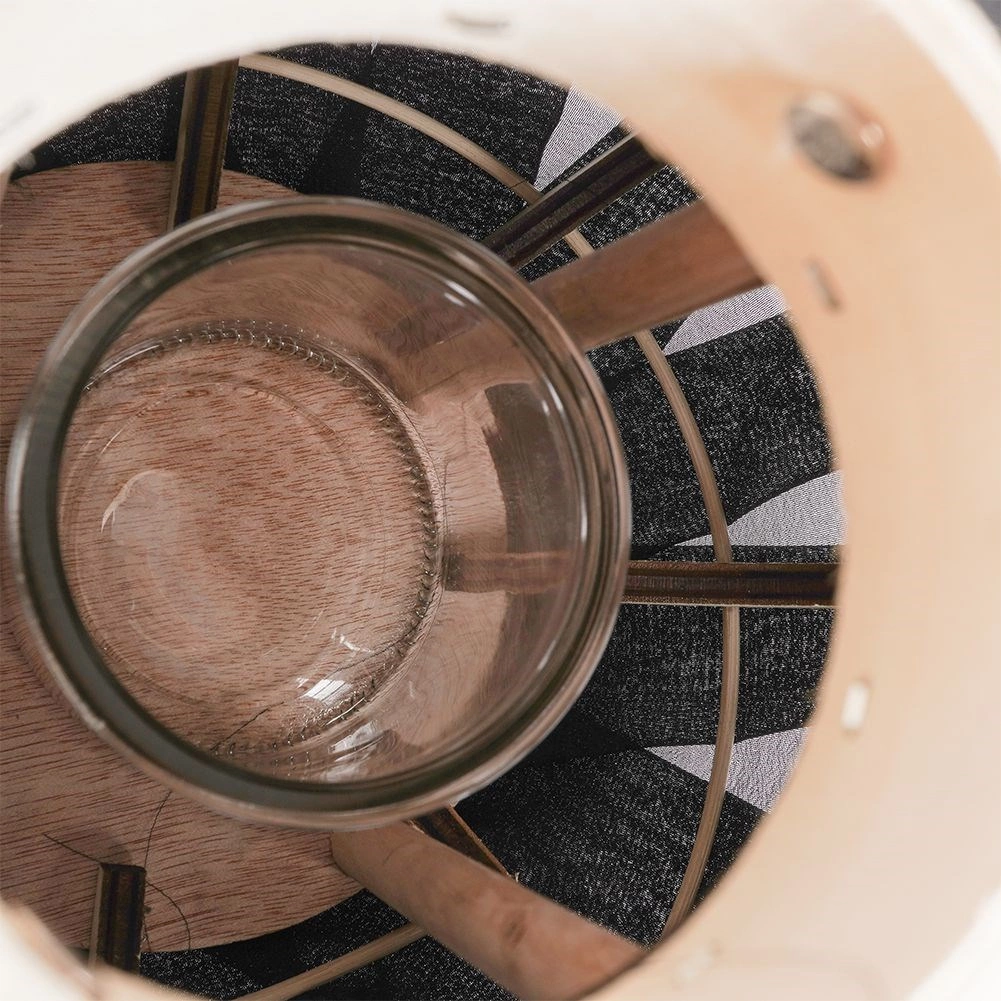 Izdržljiva konstrukcija s tekstilnim ispletom nježno raspršuje svjetlo i naglašava kako moderni, tako i industrijski (loft) stil. Umetnuti stakleni cilindar promjera 8 cm prima svijeću do cca Ø 6,5 cm.