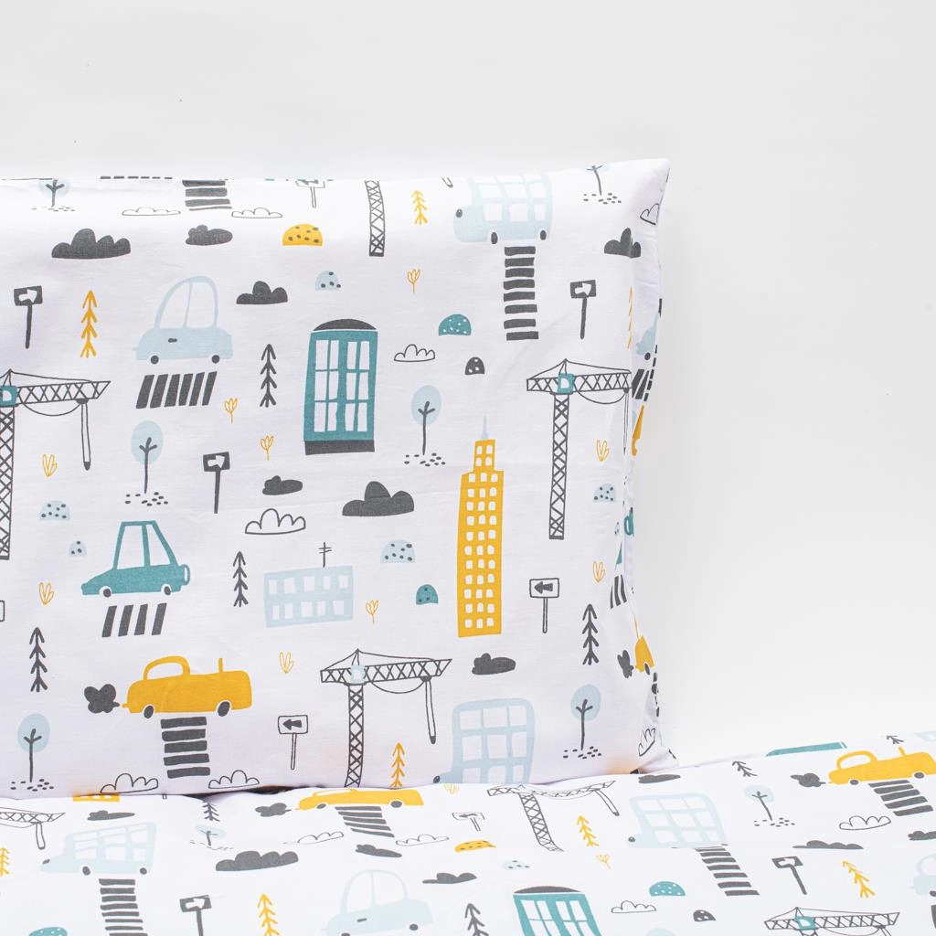 Otkrijte udobnost i sigurnost koju vašoj bebi pruža 3-dijelna posteljina za krevetić NEW BABY s motivom grada u popularnoj gorušičastoj nijansi. Set je šivan od 100% pamuka, koji je ugodan na dodir, prozračan i nježan prema osjetljivoj bebinoj koži. Praktična izvedba sa sigurnim zatvaračima bez slobodno visećih klizača i meka ogradica za zaštitu u krevetiću čine ovaj set odličnim izborom za svakodnevnu upotrebu.