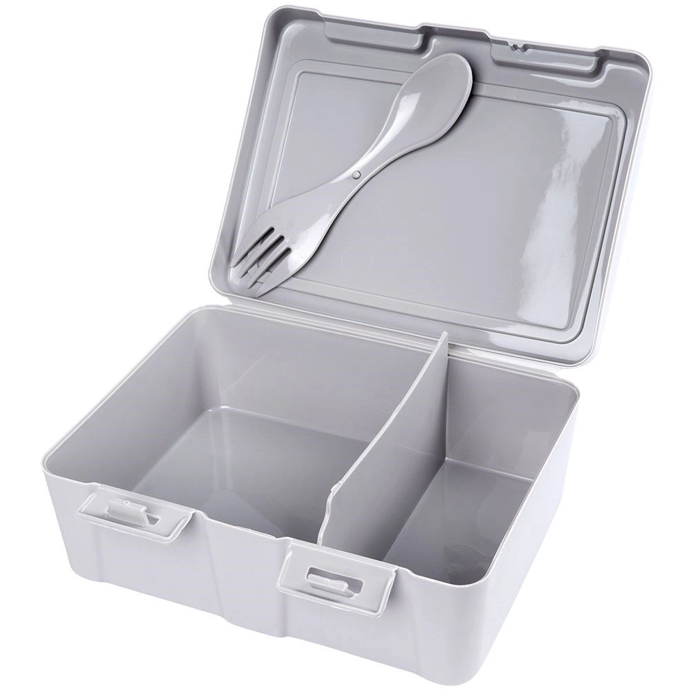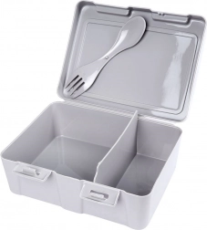 Kutija za užinu s dvije pregrade održava vašu hranu uredno odvojenu i svježom. Dio je i pametan pribor 2u1 (žlica/vilica) duljine 14,5 cm, koji ima vlastito mjesto ispod poklopca, pa će vam uvijek biti pri ruci. Izdržljiva izrada, kompaktne dimenzije i čvrsti klipsi osiguravaju pouzdano zatvaranje tijekom prenošenja.