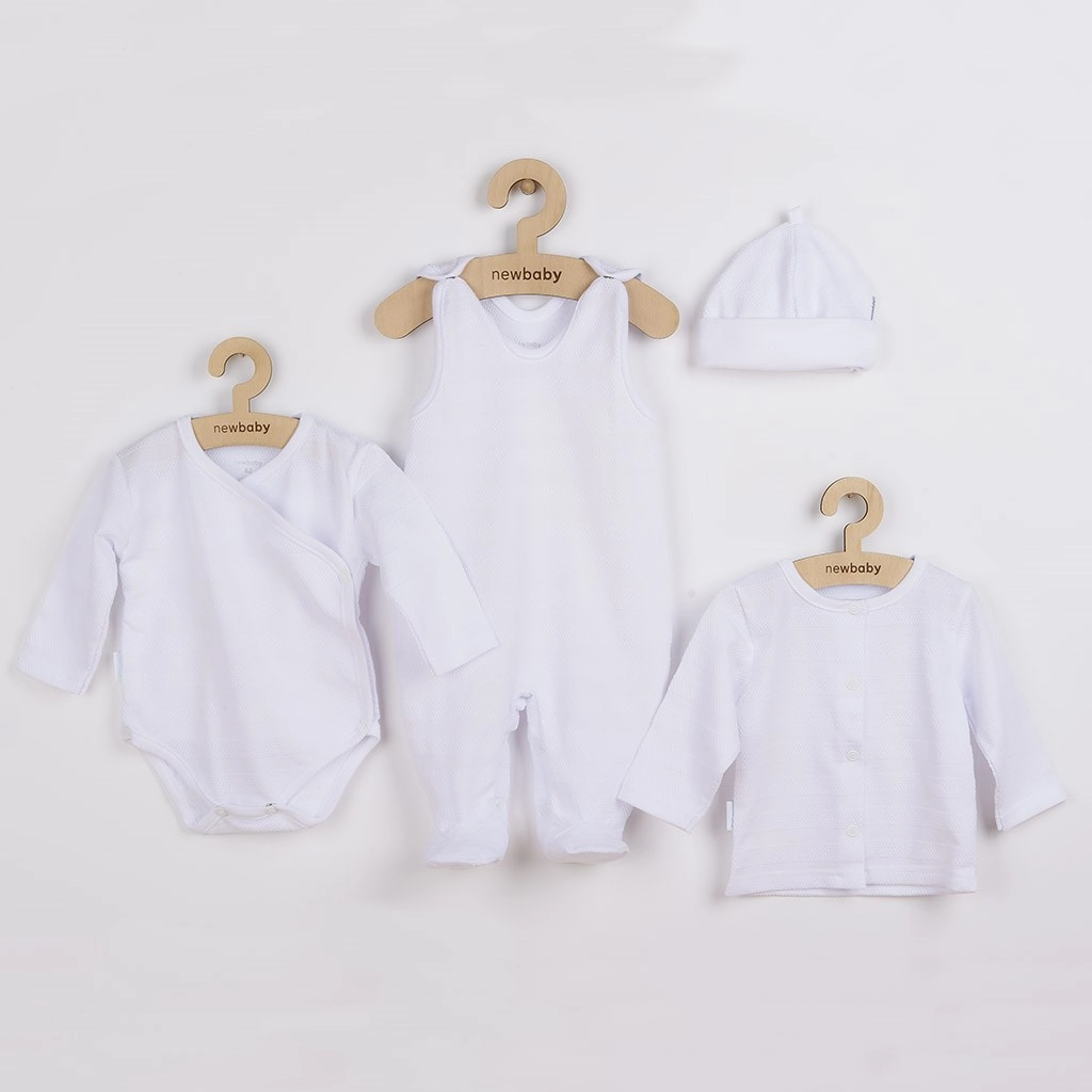 Kompletna oprema za novorođenče u elegantnoj bijeloj boji brenda NEW BABY I AM. Mekani 100% pamuk nježan je prema osjetljivoj koži, a jednostavno kopčanje na drukere na svim dijelovima olakšava odijevanje i presvlačenje. Praktičan 4-dijelni set sadrži preklopni bodi s dugim rukavima, zujalice s stopicama, jacketu na drukere i kapicu sa širim rubom. Idealno za rodilište i kao poklon.