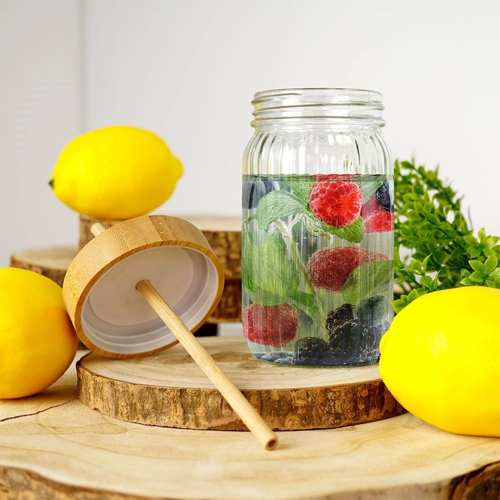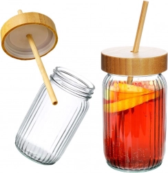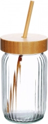 Rebrasta staklena boca za piće s bambusovim poklopcem i slamkom 500 ml