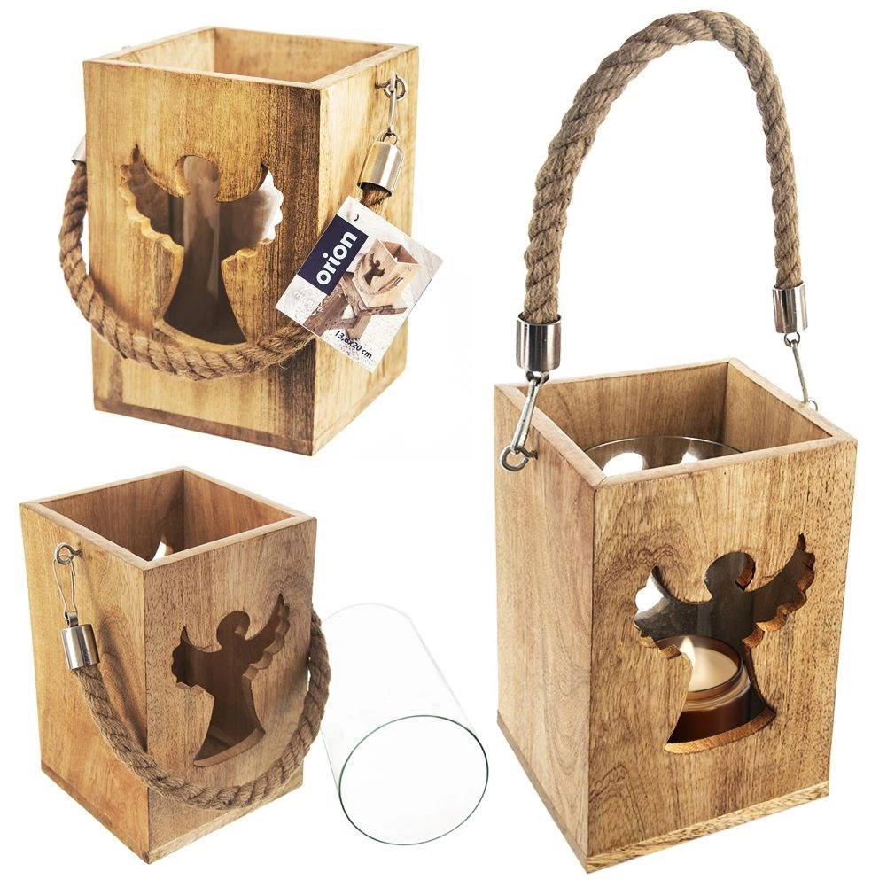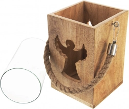 Stilski drveni lampion s motivom anđela i izvadivom staklenom čašom osigurava sigurno i efektno svjetljenje u domu i na otvorenom. Zahvaljujući čvrstoj užetnoj ručki lako ga prenesete ili objesite. Prirodno drvo i anđeoski izrez stvaraju ugodnu atmosferu i prekrasne svjetlosne efekte.