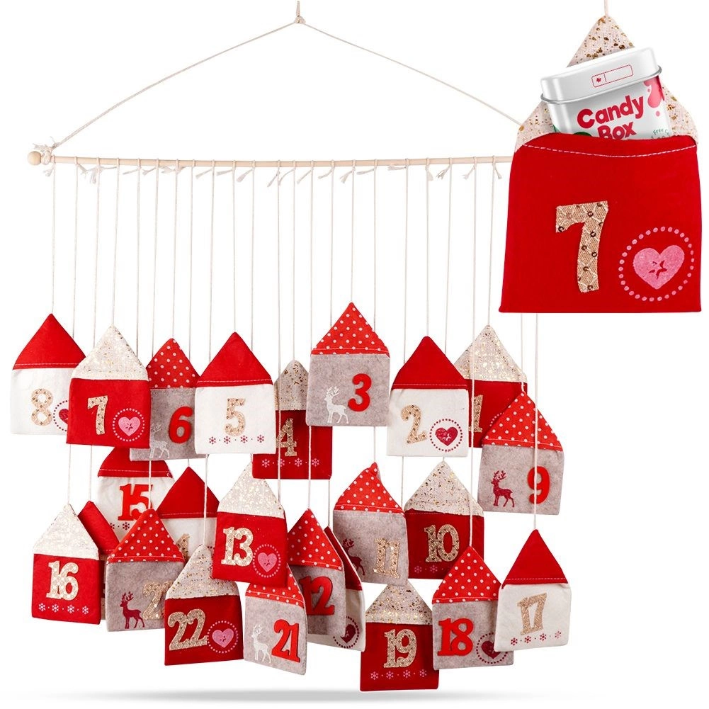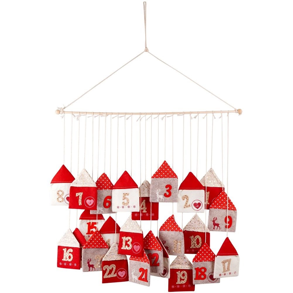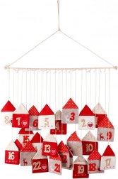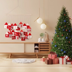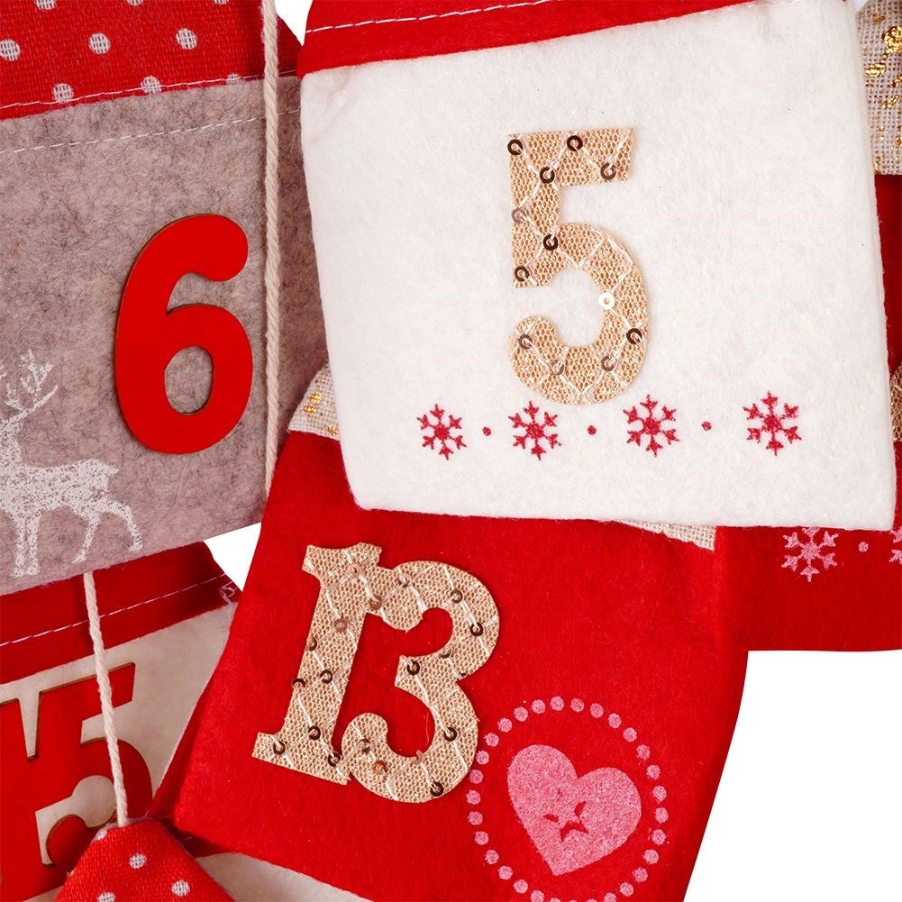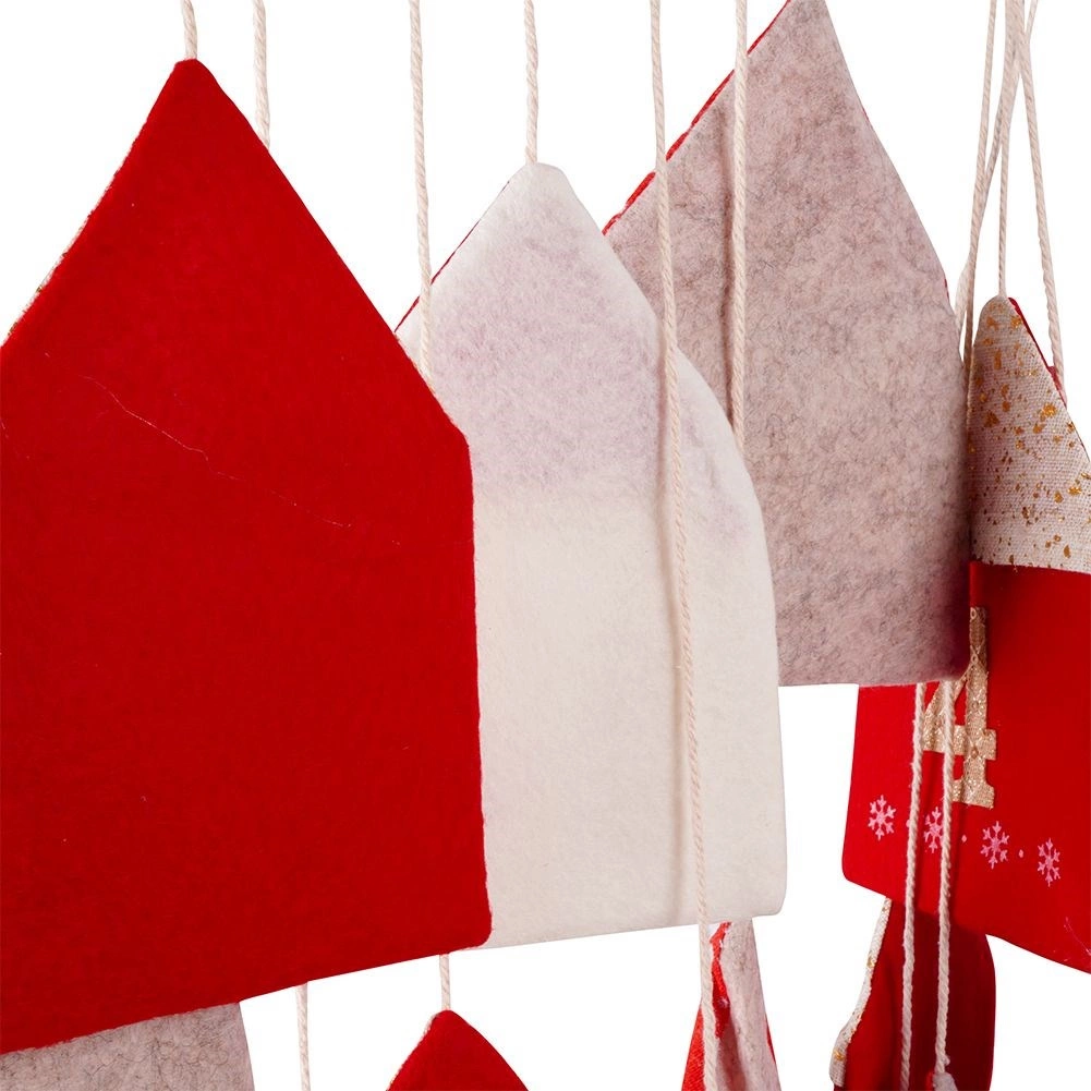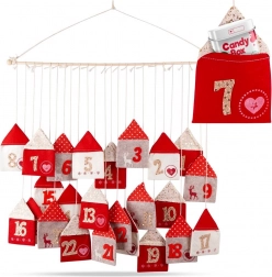 Ugodan tekstil, brojevi 1–24 i blagdanski motivi u crvenoj, bijeloj i bež boji daju interijeru toplu atmosferu.