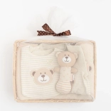 Ovaj 4-dijelni set od premium organskog pamuka nježan je prema osjetljivoj koži novorođenčadi, mekan, prozračan i izdržljiv. Kombinezon bez stopica ima praktično bočno kopčanje na drukere cijelom dužinom za lako presvlačenje. Podbradnjak se može podesiti na dvije veličine. Mekana dekica s kapuljačom održava glavicu toplom i može poslužiti i kao ručnik. Igračka sa zvečkom i pištalicom potiče osjetilni razvoj i zabavlja bebu.