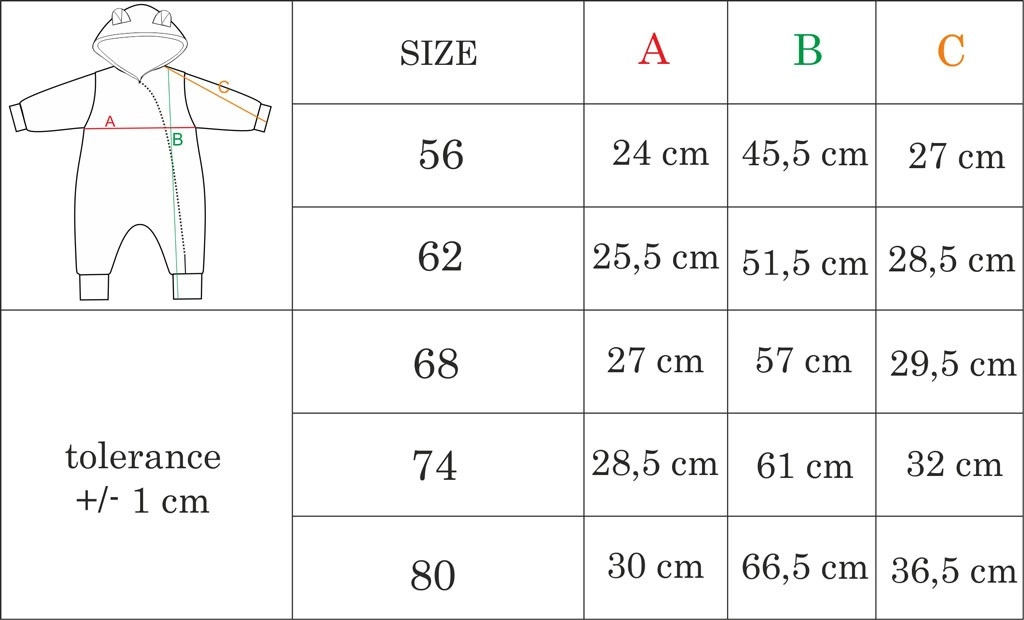 Praktično bočno zatvaranje patentnim zatvaračem cijelom dužinom olakšava oblačenje i presvlačenje. Preklopni rukavi omogućuju prilagodbu toplinskog komfora i otkrivaju toplu podstavu. Overal je odličan za jesen i zimu, za šetnje i putovanja u kolicima.